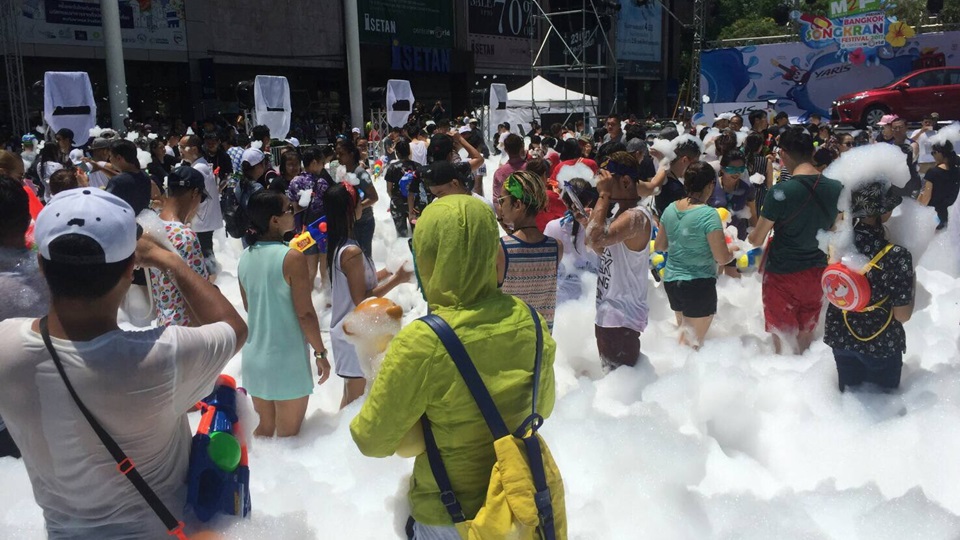 บรรยากาศที่ ลานกิจกรรม สแควร์ B ศูนย์การค้าเซ็นทรัลเวิลด์ นักท่องเที่ยวต่างสนุกสนาน กับการสาดน้ำ และปาร์ตี้โฟม