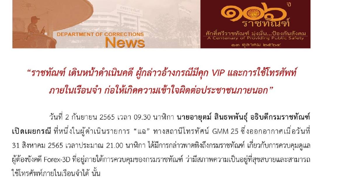 นายอายุตม์ สินธพพันธุ์ อธิบดีกรมราชทัณฑ์ เปิดเผยกรณีหนึ่งในผู้ดำเนินรายการ “แฉ” ทางสถานีโทรทัศน์ GMM 25 ซึ่งออกอากาศเมื่อวันที่ 31 สิงหาคม 2565 เวลาประมาณ 21.00 น. ได้มีการกล่าวพาดพิงถึงกรมราชทัณฑ์เกี่ยวกับการควบคุมดูแลผู้ต้องขังคดี Forex-3D ที่อยู่ภายใต้การควบคุมของกรมราชทัณฑ์ ว่า มีสภาพความเป็นอยู่ที่สุขสบายและสามารถใช้โทรศัพท์ภายในเรือนจำได้ นั้น
