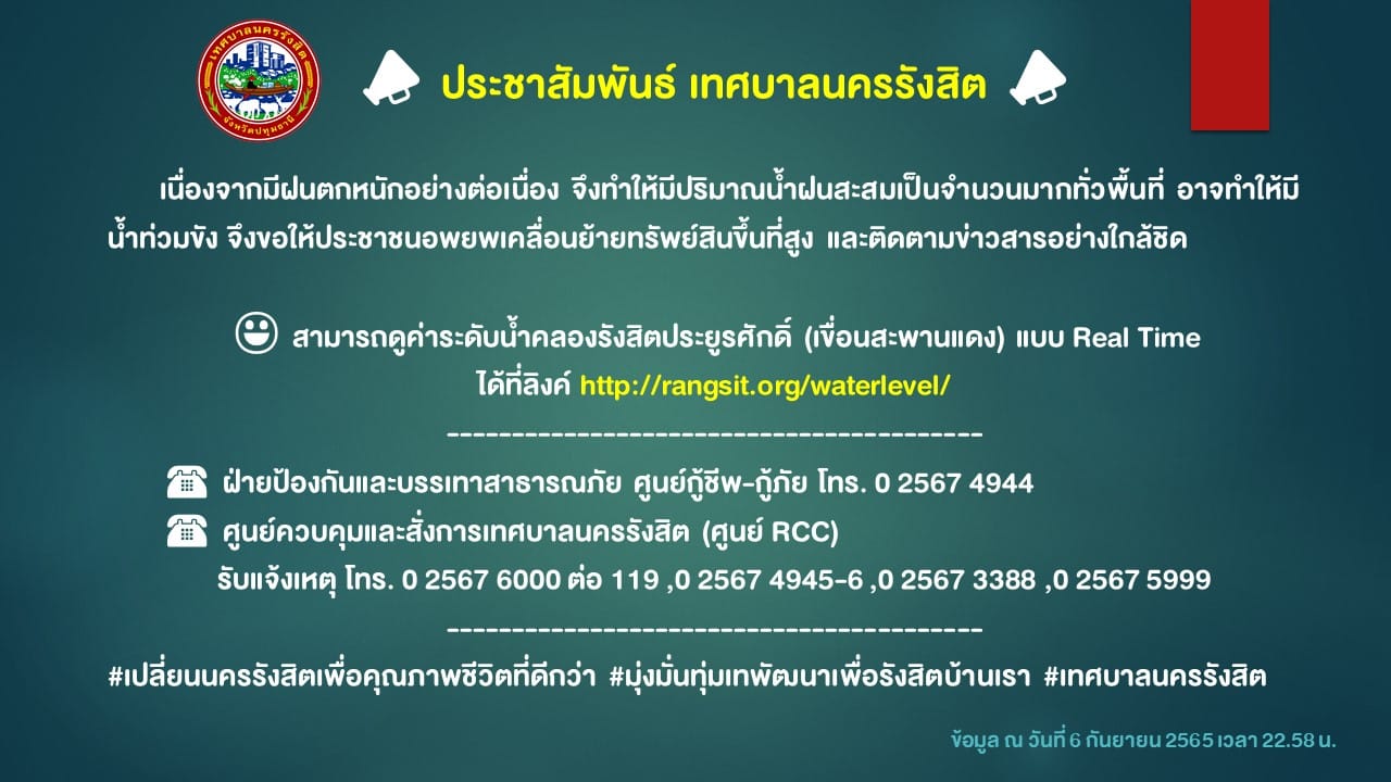 ส่วนที่ จ.ปทุมธานี พื้นที่เทศบาลนครรังสิต มีน้ำท่วมขังเต็มถนน บางจุดท่วมสูงเกือบ 2 เมตร ทางเทศบาลฯ ต้องประกาศเตือนให้ประชาชนขนย้ายทรัพย์สินขึ้นที่สูง