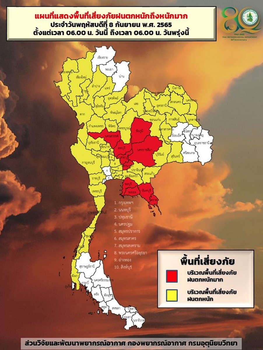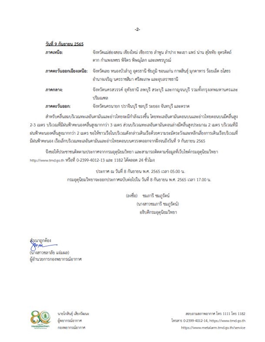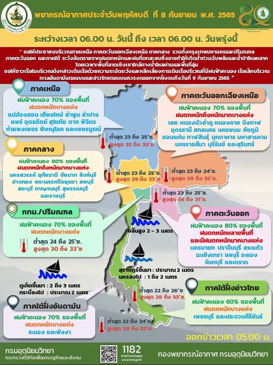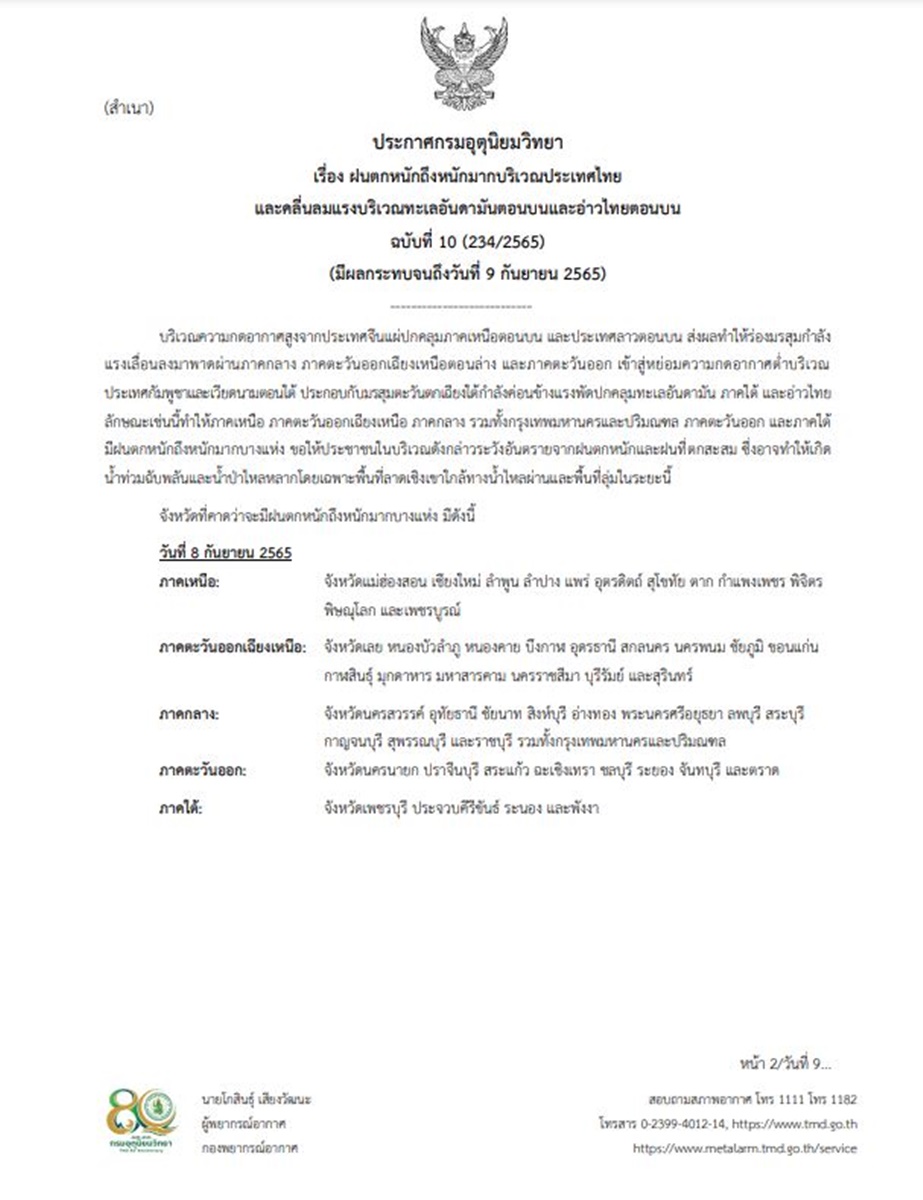 กรมอุตุนิยมวิทยา ออกประกาศ เรื่อง ฝนตกหนักถึงหนักมากบริเวณประเทศไทย และคลื่นลมแรงบริเวณทะเลอันดามันตอนบนและอ่าวไทยตอนบน (มีผลกระทบจนถึงวันที่ 9 กันยายน 2565) ฉบับที่ 10 ลงวันที่ 8 กันยายน 2565 ระบุว่า บริเวณความกดอากาศสูงจากประเทศจีนแผ่ปกคลุมภาคเหนือตอนบน และประเทศลาวตอนบน ส่งผลให้ร่องมรสุมกำลังแรงเลื่อนลงมาพาดผ่านภาคกลาง ภาคตะวันออกเฉียงเหนือตอนล่าง และภาคตะวันออก เข้าสู่หย่อมความกดอากาศต่ำบริเวณประเทศกัมพูชาและเวียดนามตอนใต้ ประกอบกับมรสุมตะวันตกเฉียงใต้กำลังค่อนข้างแรงพัดปกคลุมทะเลอันดามัน ภาคใต้ และอ่าวไทย ลักษณะเช่นนี้ทำให้ภาคเหนือ ภาคตะวันออกเฉียงเหนือ ภาคกลาง รวมทั้งกรุงเทพมหานครและปริมณฑล ภาคตะวันออก และภาคใต้ มีฝนตกหนักถึงหนักมากบางแห่ง ขอให้ประชาชนในบริเวณดังกล่าวระวังอันตรายจากฝนตกหนักและฝนที่ตกสะสม ซึ่งอาจทำให้เกิดน้ำท่วมฉับพลันและน้ำป่าไหลหลาก โดยเฉพาะพื้นที่ลาดเชิงเขาใกล้ทางน้ำไหลผ่านและพื้นที่ลุ่มในระยะนี้