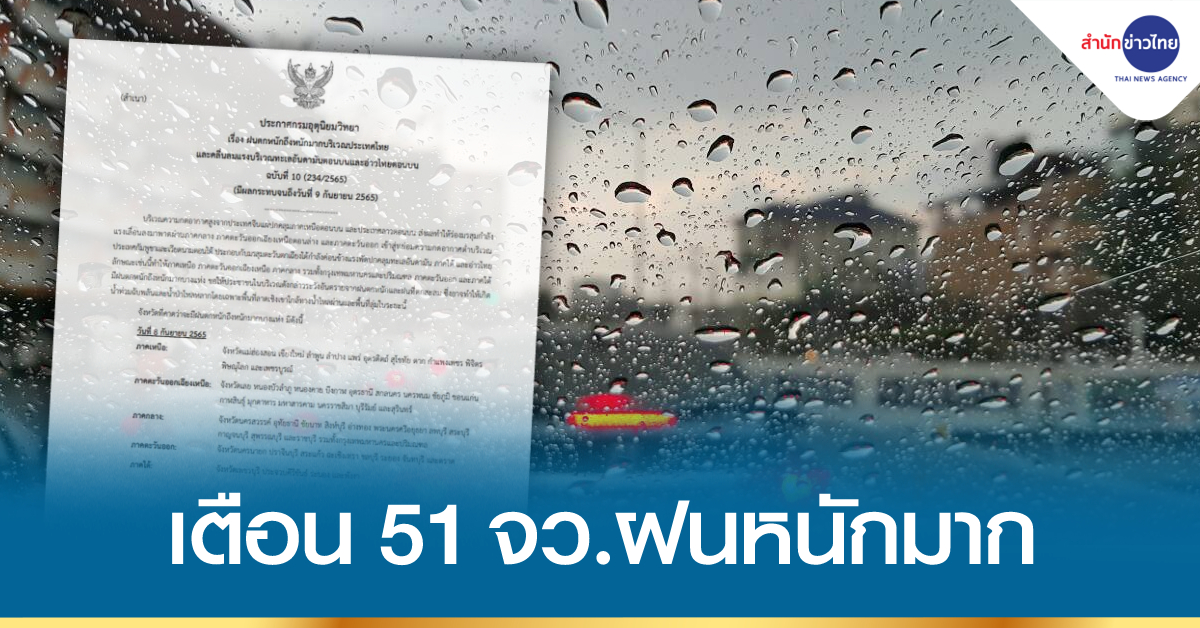 กรมอุตุฯ 8 ก.ย. – กรมอุตุฯ ประกาศฉบับที่ 10 เตือน 51 จังหวัด ฝนตกหนักถึงหนักมาก ระวังน้ำท่วมฉับพลัน-น้ำป่าไหลหลาก กทม.ฝนฟ้าคะนอง 70% ของพื้นที่
