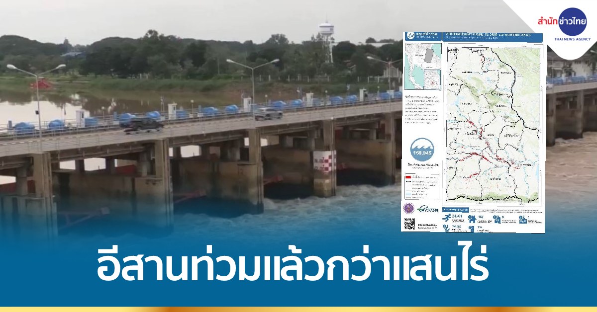 GISTDA ใช้ดาวเทียม Sentinel-1 ของวันที่ 12 กันยายน 2565 ติดตามสถานการณ์น้ำท่วม ล่าสุดพบพื้นที่น้ำท่วมขังแล้วจำนวน 159,945 ไร่ ในหลายพื้นที่ของลุ่มน้ำโขงตะวันออกเฉียงเหนือ ลุ่มน้ำชี และลุ่มน้ำมูล ได้แก่ สุรินทร์ 44,117 ไร่, ร้อยเอ็ด 43,884 ไร่, ศรีสะเกษ 26,217 ไร่, อุบลราชธานี 19,428 ไร่, ยโสธร 14,210 ไร่, สกลนคร 4,560 ไร่, นครพนม 4,103 ไร่, กาฬสินธุ์ 2,688 ไร่, อำนาจเจริญ 644 ไร่ บึงกาฬ 83 ไร่ และบุรีรัมย์ 11 ไร่ ในขณะที่พื้นที่นาข้าวได้รับผลกระทบแล้วทั้งสิ้น 76,587 ไร่