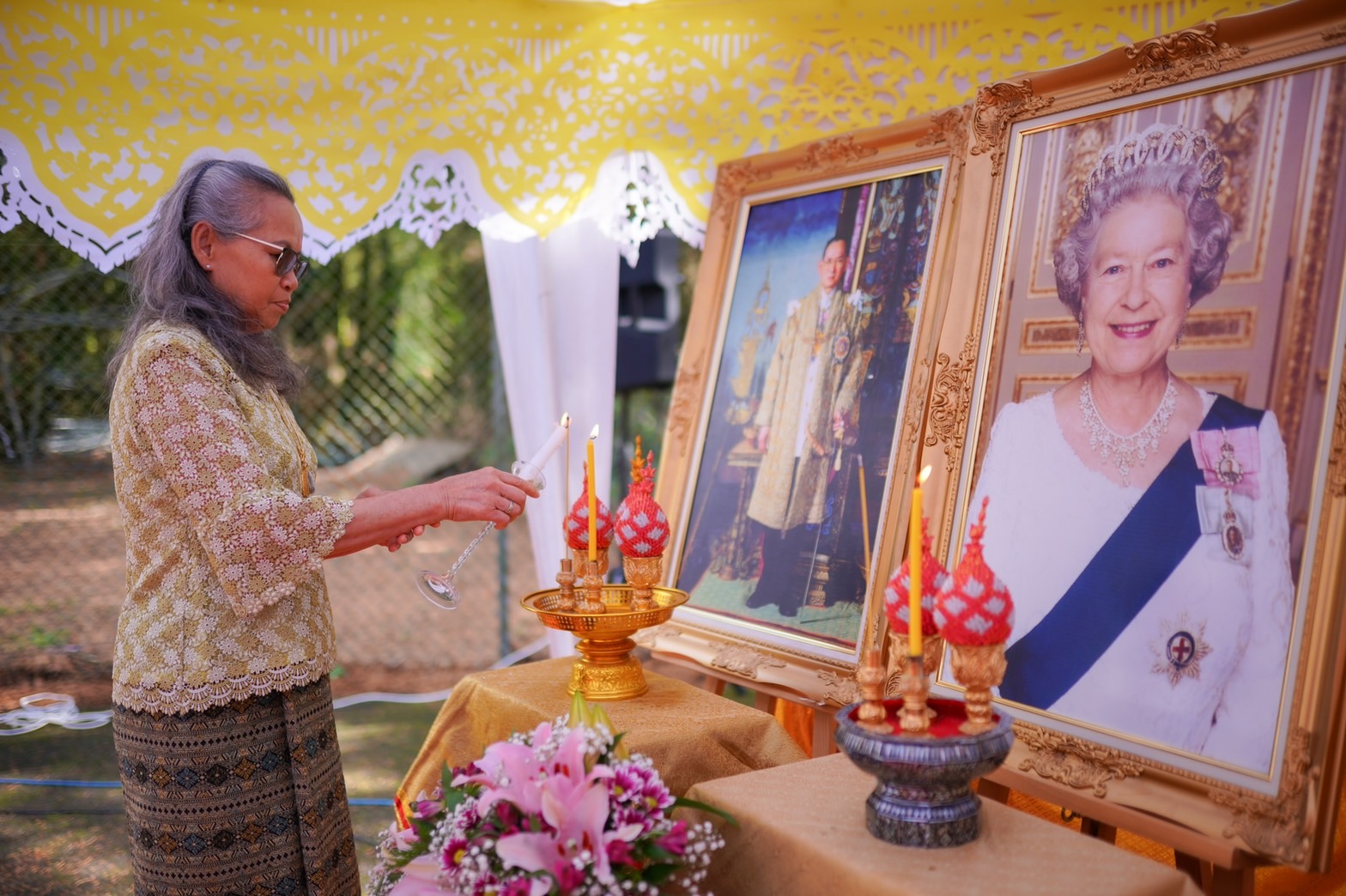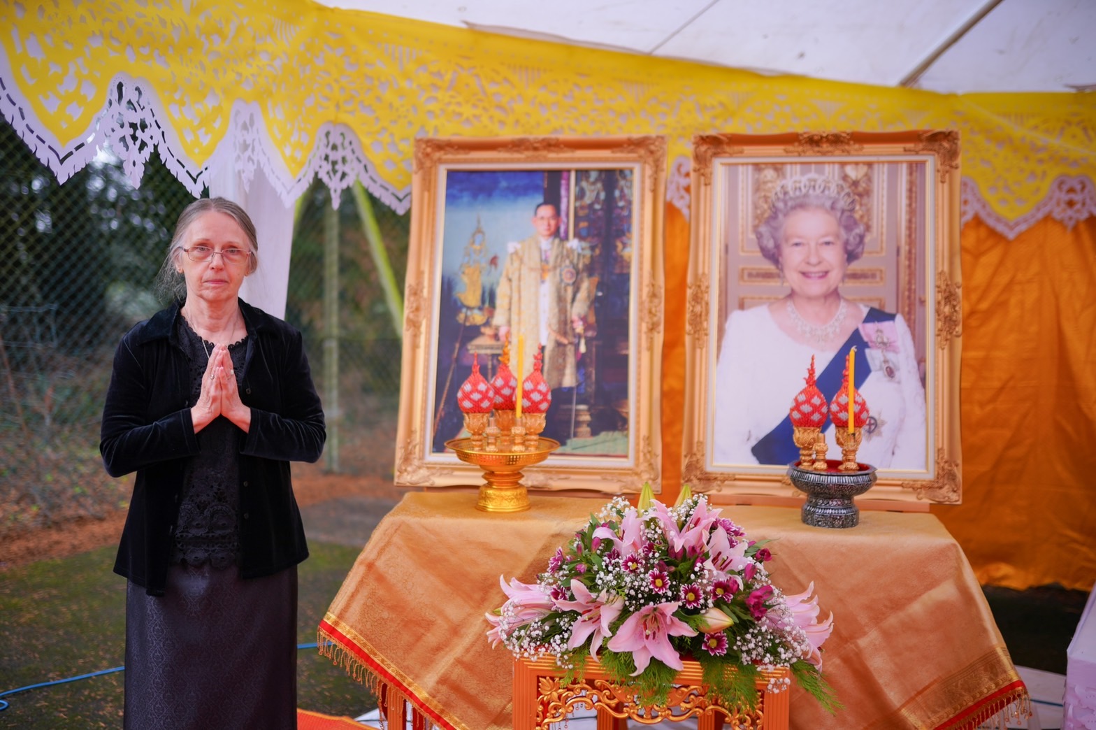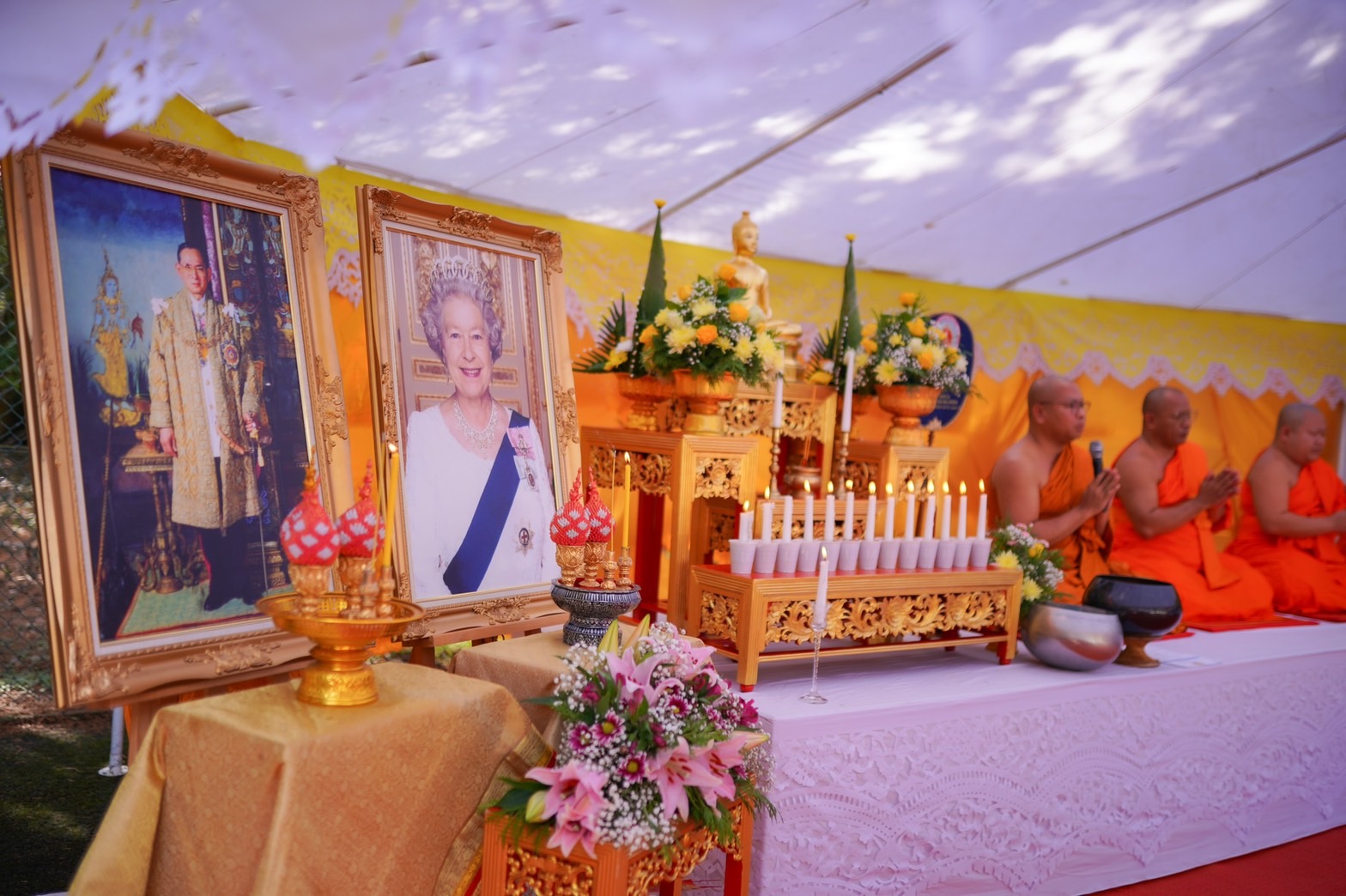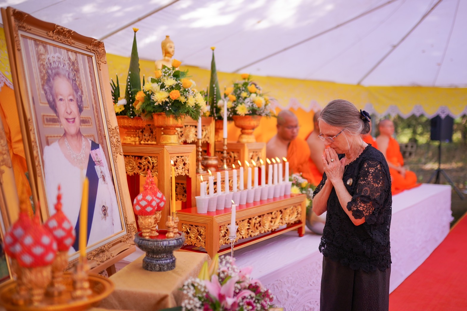 สำหรับพิธีบำเบ็ญกุศลในครั้งนี้ วัดอรุณสหราชอาณาจักร ได้ถือปฏิบัติตามประเพณีที่ดีงามของคนไทย อัญเชิญพระฉายาลักษณ์ของในหลวงรัชกาลที่ 9 เพื่อน้อมกุศลครั้งนี้ถวายแด่พระองค์ท่าน ด้วยน้อมระลึกถึงว่า สมเด็จพระราชินีนาถเอลิซาเบธที่ 2 และ ในหลวงรัชกาลที่ 9 ต่างมีสัมพันธไมตรีที่เน้นแฟ้น โดยสมเด็จพระราชินีนาถเอลิซาเบธที่ 2 ได้เคยเสด็จเยือนประเทศไทยอย่างเป็นทางการถึง 2 ครั้ง ในปี พ.ศ. 2515 และ 2539 พระองค์ทรงประทับใจกับมิตรไมตรีทุกครั้งที่เสด็จเยือนเป็นที่ปีติยินดีของพสกนิกรทั้ง 2 ประเทศ