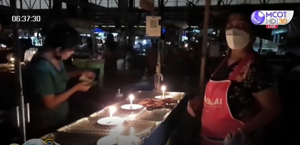 พ่อค้าแม่ค้าต่างแก้ปัญหาด้วยการจุดเทียนไข หรือใช้ไฟฉาย ในการค้าขาย เพื่อแก้ปัญหาเฉพาะหน้า ไม่เช่นนั้นสินค้าที่เตรียมมาจะขายไม่ได้ และต้องขาดทุน บางรายถึงกับลด แลก แจก แถม เพื่อระบายสินค้าให้หมดลงโดยเร็ว