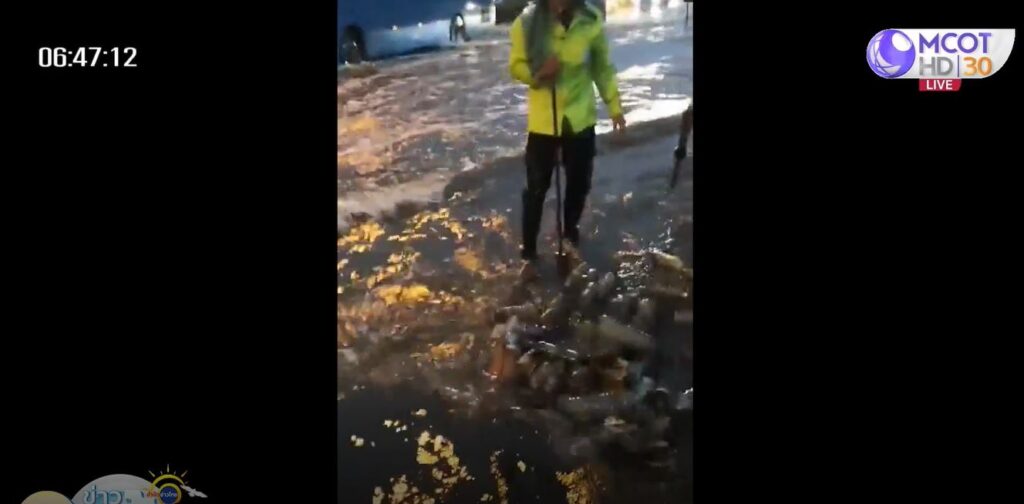 เพจเฟซบุ๊ก “สำนักงานประชาสัมพันธ์ กรุงเทพมหานคร” เผยแพร่คลิปเจ้าหน้าที่สำนักการระบายน้ำลงพื้นที่แก้ปัญหาน้ำท่วม โดยเปิดฝาท่อ เพื่อเร่งระบายน้ำบนถนนหลวงแพ่ง ช่วงคลองทับยาวถึงคลองพระยาเพชร เขตลาดกระบัง ปรากฏว่าพบขวดเป็นจำนวนมากลอยเอ่อขึ้นมาจากท่อ