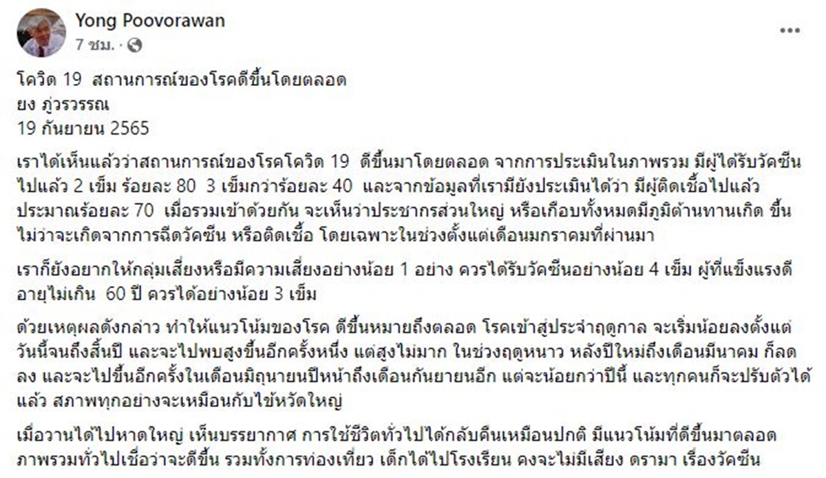 ศ.นพ.ยง ภู่วรวรรณ หัวหน้าศูนย์เชี่ยวชาญเฉพาะทางด้านไวรัสวิทยาคลินิก คณะแพทยศาสตร์ จุฬาลงกรณ์มหาวิทยาลัย โพสต์เฟซบุ๊ก กล่าวถึงโควิด-19 ว่า ในภาพรวมมีผู้ได้รับวัคซีนไปแล้ว 2 เข็ม ร้อยละ 80 และวัคซีน 3 เข็ม กว่าร้อยละ 40 และมีผู้ติดเชื้อไปแล้วประมาณร้อยละ 70 เมื่อรวมเข้าด้วยกัน จะเห็นว่าประชากรส่วนใหญ่ หรือเกือบทั้งหมด มีภูมิต้านทานเกิดขึ้น ไม่ว่าจะเกิดจากการฉีดวัคซีน หรือติดเชื้อ อย่างไรก็ตาม ยังอยากให้กลุ่มเสี่ยงควรได้รับวัคซีนอย่างน้อย 4 เข็ม ผู้ที่แข็งแรงดี อายุไม่เกิน 60 ปี ควรได้รับอย่างน้อย 3 เข็ม