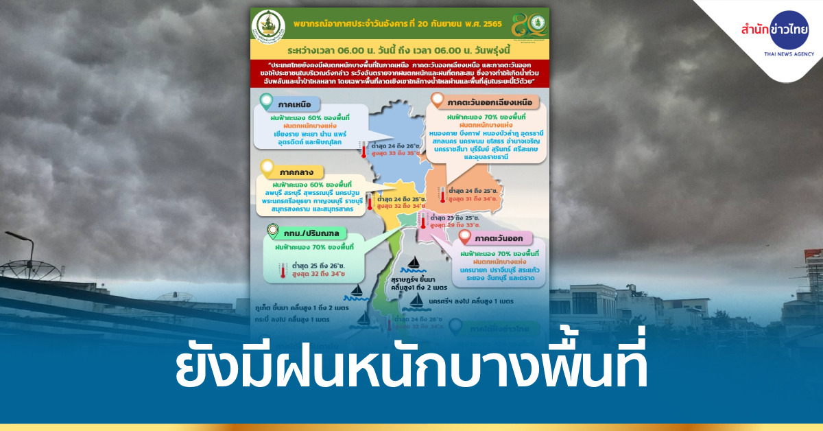 กรุงเทพฯ 20 ก.ย. – กรมอุตุฯ เผยประเทศไทยยังคงมีฝนตกหนักบางพื้นที่ในภาคเหนือ ภาคอีสาน และภาคตะวันออก ขณะที่ กทม.-ปริมณฑล มีฝนฟ้าคะนอง 70% ของพื้นที่