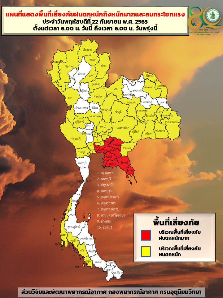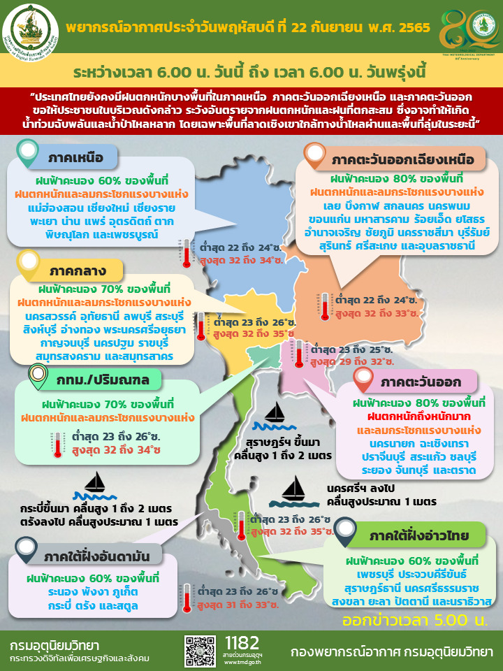 กรมอุตุนิยมวิทยา พยากรณ์อากาศ 24 ชั่วโมงข้างหน้า บริเวณความกดอากาศสูงหรือมวลอากาศเย็นอีกระลอกหนึ่งจากประเทศจีนแผ่ลงมาปกคลุมประเทศลาวตอนบนและประเทศเวียดนามตอนบน ส่งผลทำให้ร่องมรสุมพาดผ่านภาคเหนือตอนล่าง ภาคกลางตอนบน เข้าสู่หย่อมความกดอากาศต่ำบริเวณภาคตะวันออกเฉียงเหนือตอนล่าง ประกอบกับมรสุมตะวันตกเฉียงใต้ที่พัดปกคลุมทะเลอันดามัน ภาคใต้ และอ่าวไทยมีกำลังปานกลาง ลักษณะเช่นนี้ทำให้ประเทศไทยมีฝนตกหนักถึงหนักมากกับมีลมกระโชกแรงบางแห่งในภาคเหนือ ภาคตะวันออกเฉียงเหนือ ภาคกลางรวมทั้งกรุงเทพมหานครและปริมณฑล รวมทั้งภาคตะวันออก ขอให้ประชาชนในบริเวณดังกล่าวระวังอันตรายจากฝนตกหนักและฝนที่ตกสะสม ซึ่งอาจทำให้เกิดน้ำท่วมฉับพลันและน้ำป่าไหลหลาก โดยเฉพาะพื้นที่ลาดเชิงเขาใกล้ทางน้ำไหลผ่านและพื้นที่ลุ่มในระยะนี้ไว้ด้วย
