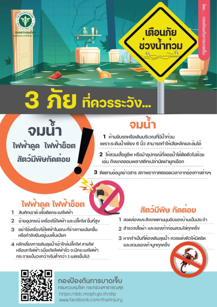 นพ.โอภาส การย์กวินพงศ์ อธิบดีกรมควบคุมโรค กล่าวว่า ขณะนี้มีฝนตกหนักอย่างต่อเนื่องในหลายพื้นที่ ส่งผลให้บางพื้นที่มีน้ำท่วมสูง หรือน้ำท่วมฉับพลัน กรมควบคุมโรคมีความห่วงใยประชาชนในพื้นที่ที่ได้รับผลกระทบ จึงขอให้ประชาชนระมัดระวังภัยสุขภาพที่อาจทำให้เกิดอันตรายและได้รับบาดเจ็บ เช่น การจมน้ำ สัตว์มีพิษกัดต่อย และไฟฟ้าดูด ไฟฟ้าช็อต