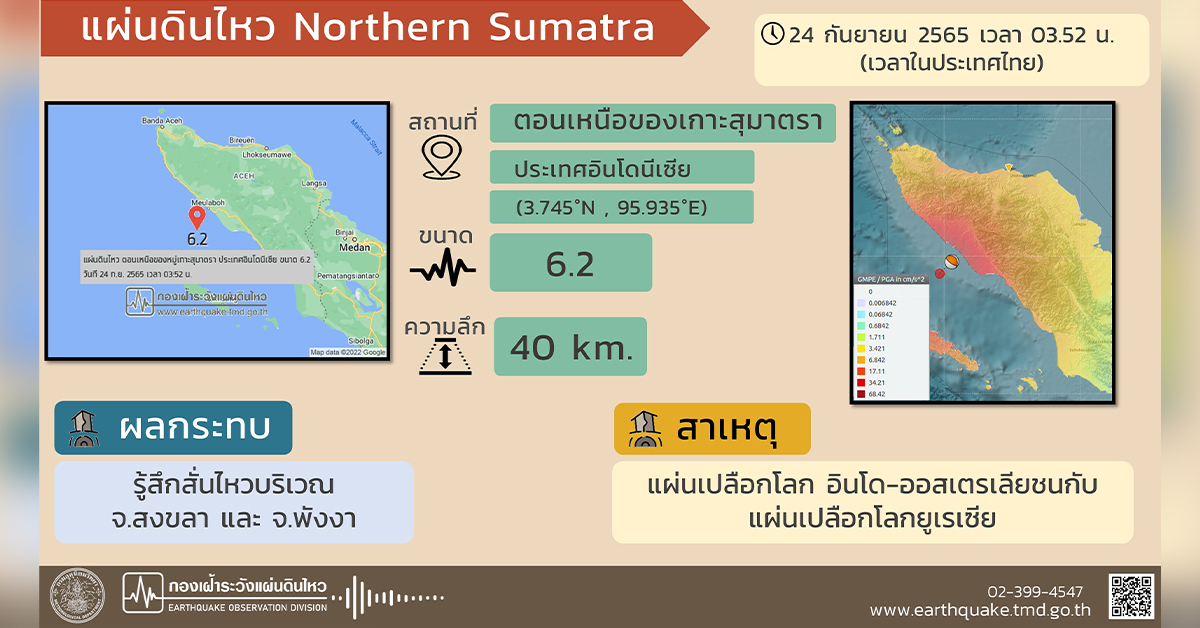 กทม. 24 ก.ย.- แผ่นดินไหว ขนาด 6.2 ตอนเหนือเกาะสุมาตรา รับรู้แรงสั่นไหวได้ถึง 3 จังหวัดใต้ “สงขลา พังงา ภูเก็ต” ด้าน ปภ.สั่งหน่วยงานที่เกี่ยวข้องติดตามสถานการณ์