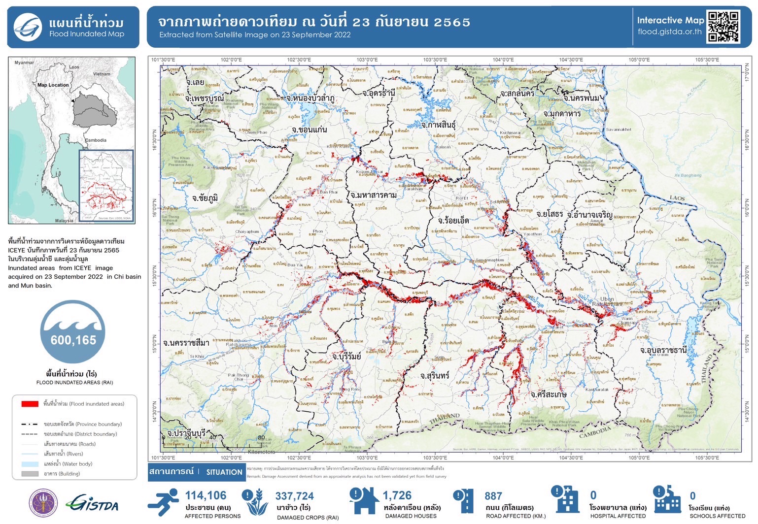23 กันยายน 65 ข้อมูลจากดาวเทียม ICEYE พบน้ำท่วมขังในบริเวณหลายพื้นที่ของลุ่มน้ำชี และลุ่มน้ำมูล ทั้งสิ้น 600,165 ไร่ แบ่งเป็นจังหวัดศรีสะเกษ 124,049 ไร่ สุรินทร์ 98,322 ไร่ บุรีรัมย์ 84,708 ไร่ นครราชสีมา 71,986 ไร่ อุบลราชธานี 50,347 ไร่ ร้อยเอ็ด 45,231 ไร่ มหาสารคาม 39,927 ไร่ ยโสธร 31,665 ไร่ ขอนแก่น 24,220 ไร่ ชัยภูมิ 16,303 ไร่ กาฬสินธุ์ 12,869 ไร่ อำนาจเจริญ 277 ไร่ และอุดรธานี 261 ไร่ ส่วนพื้นที่ปลูกข้าวได้รับผลกระทบทั้งสิ้น 337,724 ไร่