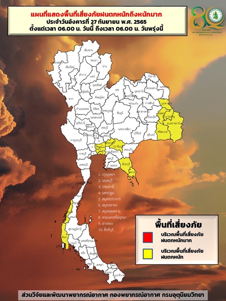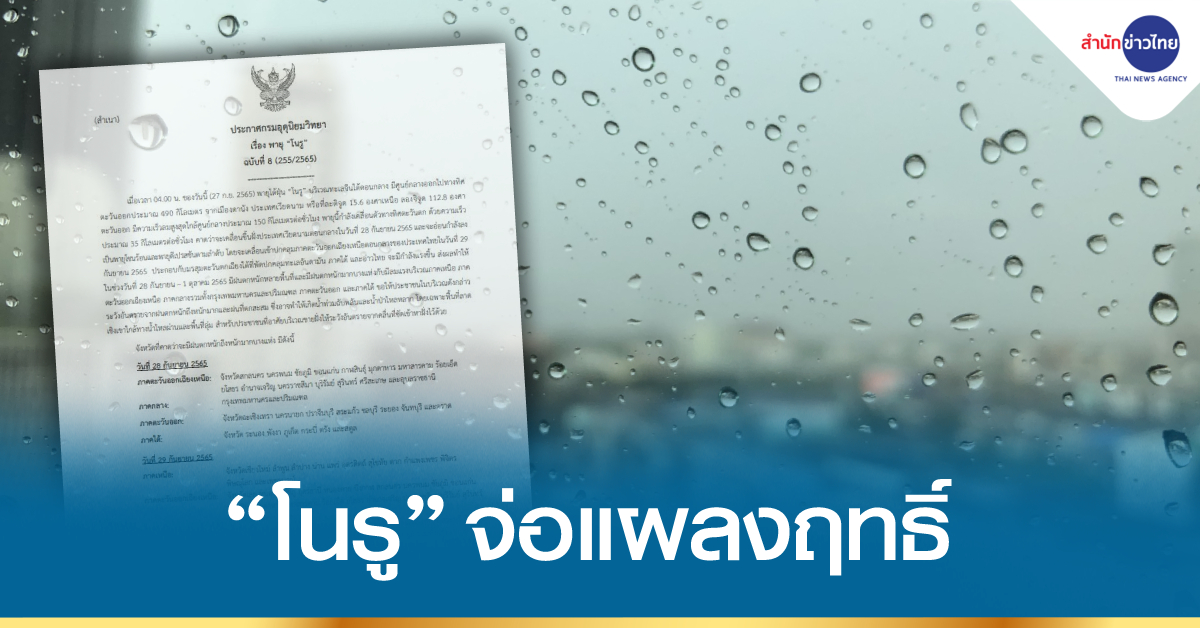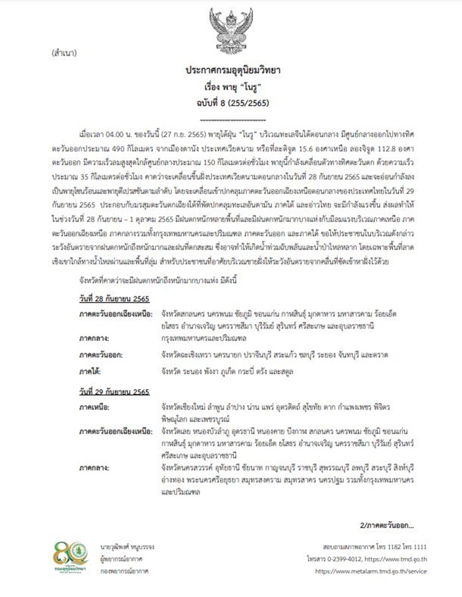 กรมอุตุนิยมวิทยา ออกประกาศ เรื่อง “พายุโนรู” ฉบับที่ 8 ลงวันที่ 27 กันยายน 2565 ระบุว่า เมื่อเวลา 04.00 น. วันนี้ (27 ก.ย.65) พายุไต้ฝุ่น “โนรู” บริเวณทะเลจีนใต้ตอนกลาง มีศูนย์กลางออกไปทางทิศตะวันออกประมาณ 490 กิโลเมตร จากเมืองดานัง ประเทศเวียดนาม หรือที่ละติจูด 15.6 องศาเหนือ ลองจิจูด 112.8 องศาตะวันออก มีความเร็วลมสูงสุดใกล้ศูนย์กลางประมาณ 150 กิโลเมตร/ชั่วโมง พายุนี้กำลังเคลื่อนตัวทางทิศตะวันตก ด้วยความเร็วประมาณ 35 กิโลเมตร/ชั่วโมง คาดว่าจะเคลื่อนขึ้นฝั่งประเทศเวียดนามตอนกลาง ในวันที่ 28 กันยายน 2565 และจะอ่อนกำลังลงเป็นพายุโซนร้อนและพายุดีเปรสชัน ตามลำดับ โดยจะเคลื่อนเข้าปกคลุมภาคตะวันออกเฉียงเหนือตอนกลางของประเทศไทย ในวันที่ 29 กันยายน 2565 ประกอบกับมรสุมตะวันตกเฉียงใต้ที่พัดปกคลุมทะเลอันดามัน ภาคใต้ และอ่าวไทย จะมีกำลังแรงขึ้น ส่งผลทำให้ในช่วงวันที่ 28 กันยายน – 1 ตุลาคม 2565 มีฝนตกหนักหลายพื้นที่ และมีฝนตกหนักมากบางแห่งกับมีลมแรง บริเวณภาคเหนือ ภาคตะวันออกเฉียงเหนือ ภาคกลาง รวมทั้งกรุงเทพมหานครและปริมณฑล ภาคตะวันออก และภาคใต้ ขอให้ประชาชนในบริเวณดังกล่าวระวังอันตรายจากฝนตกหนักถึงหนักมากและฝนที่ตกสะสม ซึ่งอาจทำให้เกิดน้ำท่วมฉับพลันและน้ำป่าไหลหลาก โดยเฉพาะพื้นที่ลาดเชิงเขาใกล้ทางน้ำไหลผ่านและพื้นที่ลุ่ม สำหรับประชาชนที่อาศัยบริเวณชายฝั่งให้ระวังอันตรายจากคลื่นที่ซัดเข้าหาฝั่งไว้ด้วย