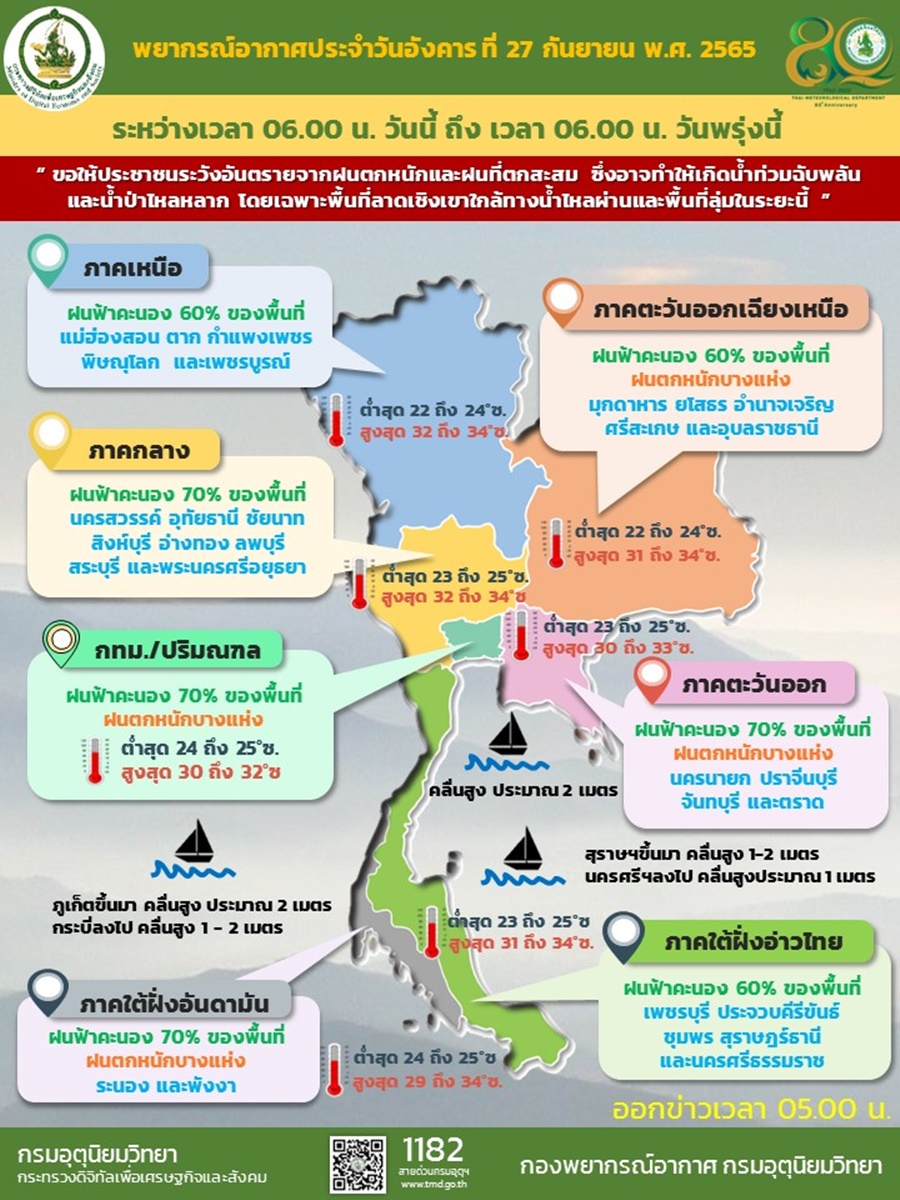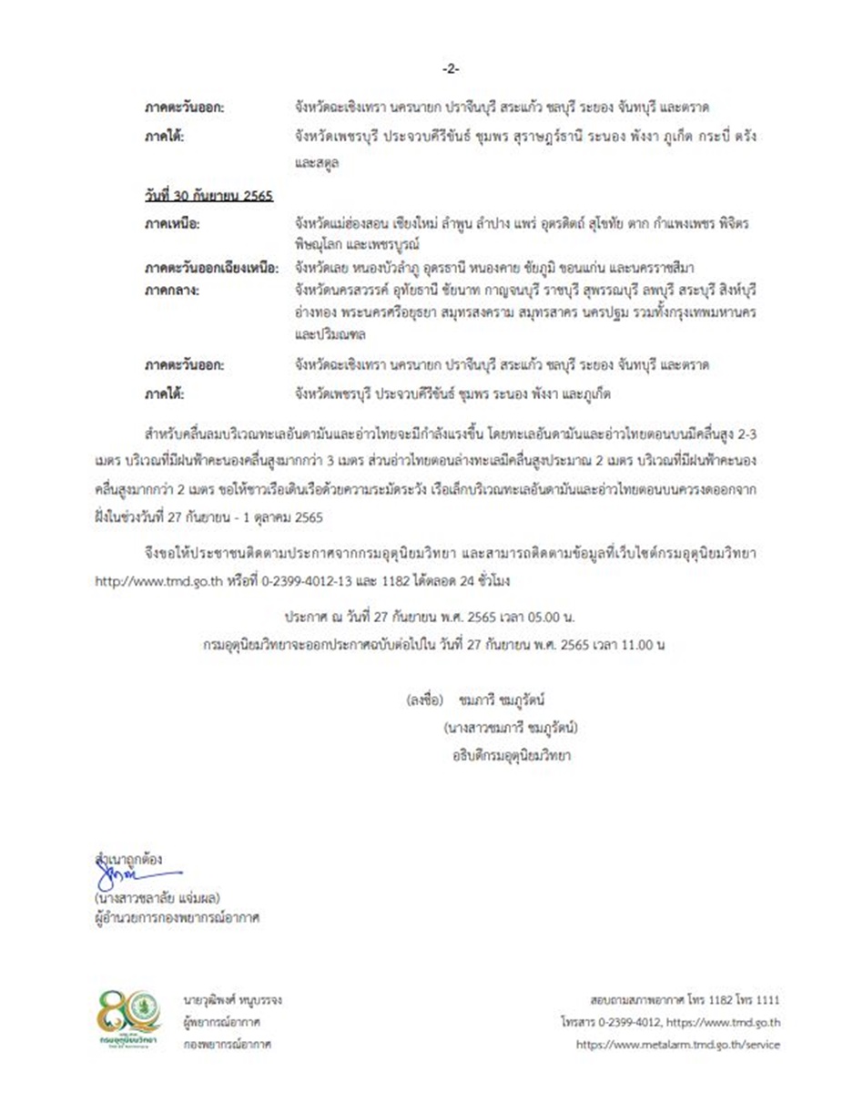 ส่วนคลื่นลมบริเวณทะเลอันดามันและอ่าวไทยจะมีกำลังแรงขึ้น โดยทะเลอันดามันและอ่าวไทยตอนบนมีคลื่นสูง 2-3 เมตร บริเวณที่มีฝนฟ้าคะนองคลื่นสูงมากกว่า 3 เมตร อ่าวไทยตอนล่างมีคลื่นสูงประมาณ 2 เมตร บริเวณที่มีฝนฟ้าคะนองคลื่นสูงมากกว่า 2 เมตร ขอให้ชาวเรือเดินเรือด้วยความระมัดระวัง เรือเล็กบริเวณทะเลอันดามันและอ่าวไทยตอนบน ควรงดออกจากฝั่งในช่วงวันที่ 27 กันยายน – 1 ตุลาคม 2565