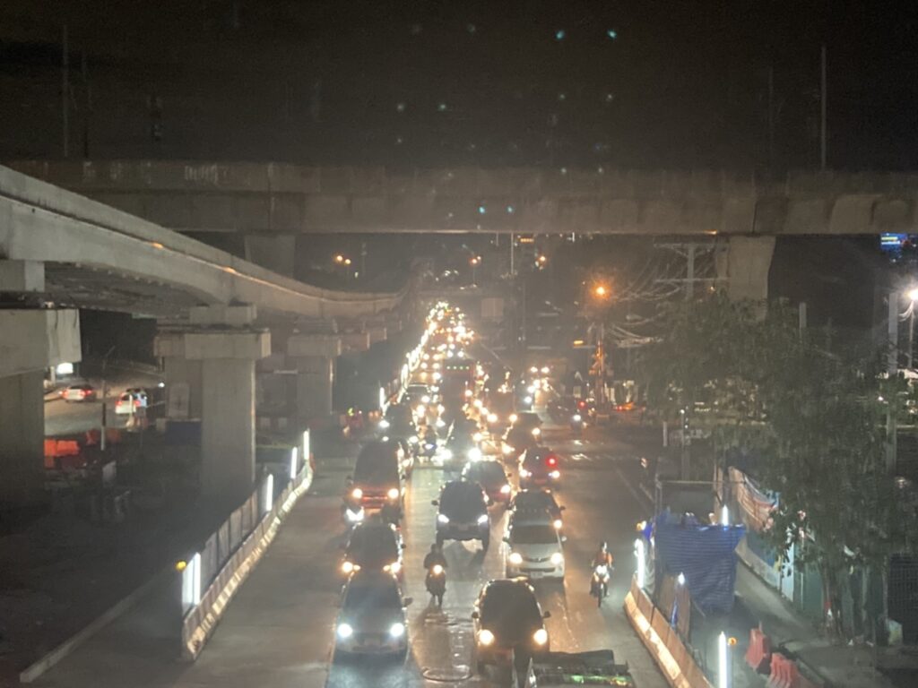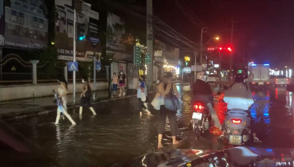 กรุงเทพฯ 27 ก.ย. – น้ำท่วมขังพื้นที่ด้านตะวันออกเฉียงใต้ของกรุงเทพฯ หลายจุด หลังฝนฟ้าคะนองช่วงเย็น ถนนลาดกระบังใกล้สี่แยกสุขสมาน มีน้ำท่วมขัง บางจุดลึกเท่าทางเท้า ประชาชนที่ใช้รถสาธารณะยังตกค้างอยู่ตามข้างทางจำนวนมาก