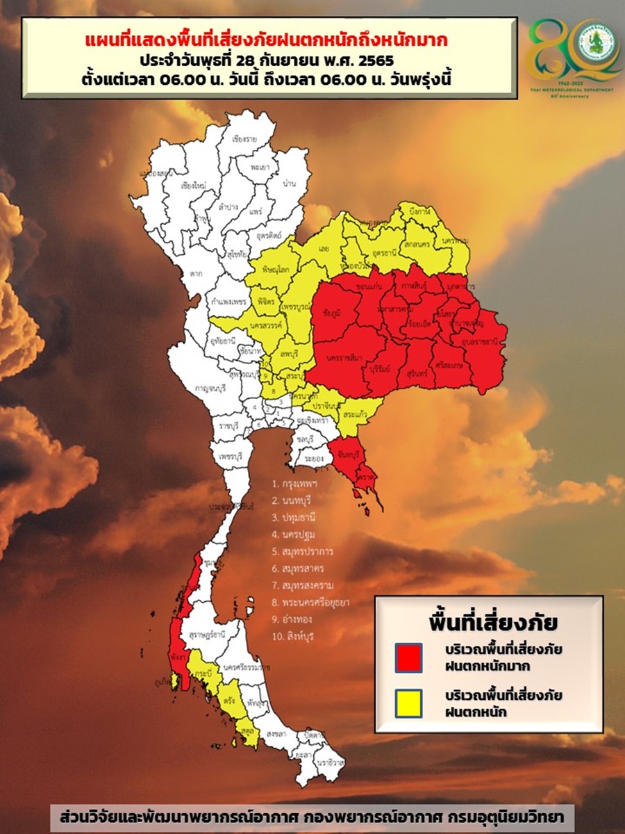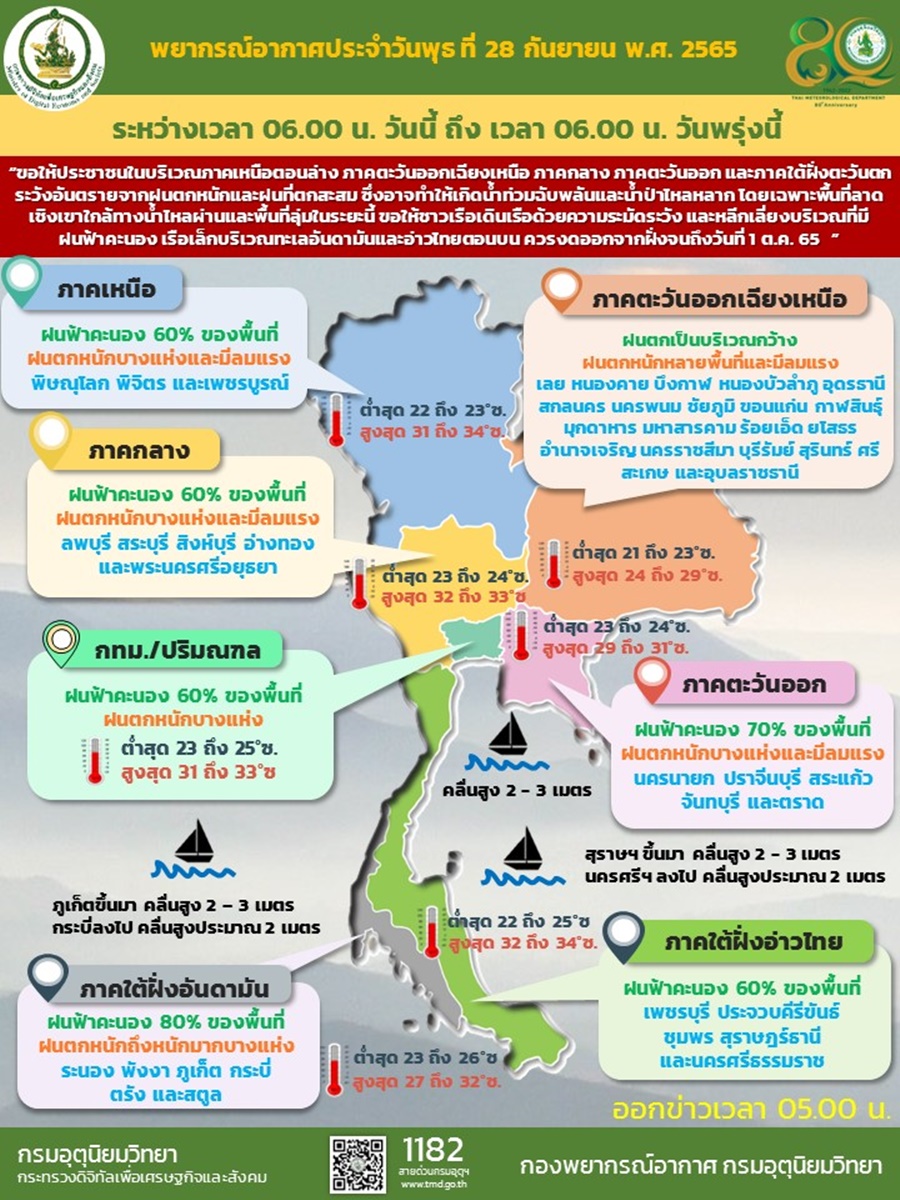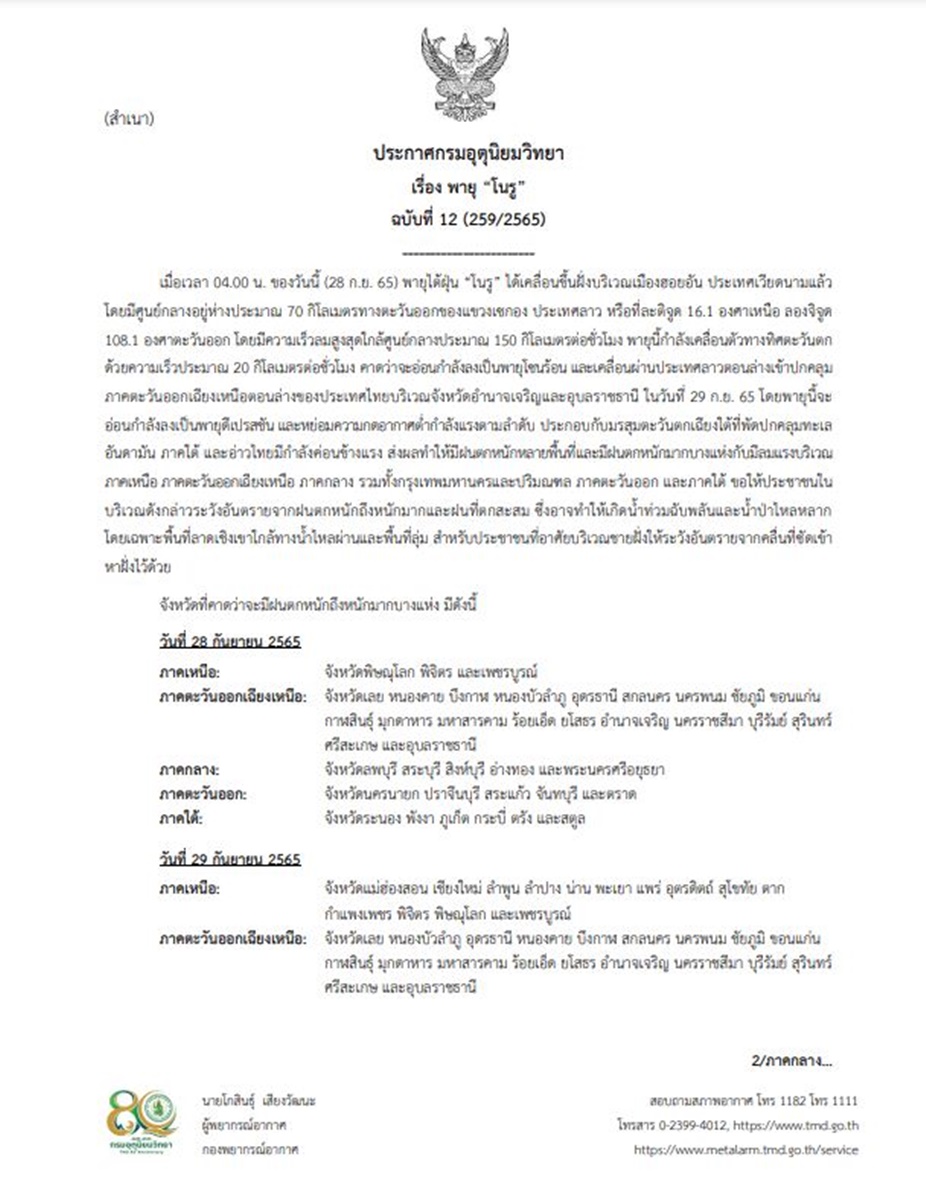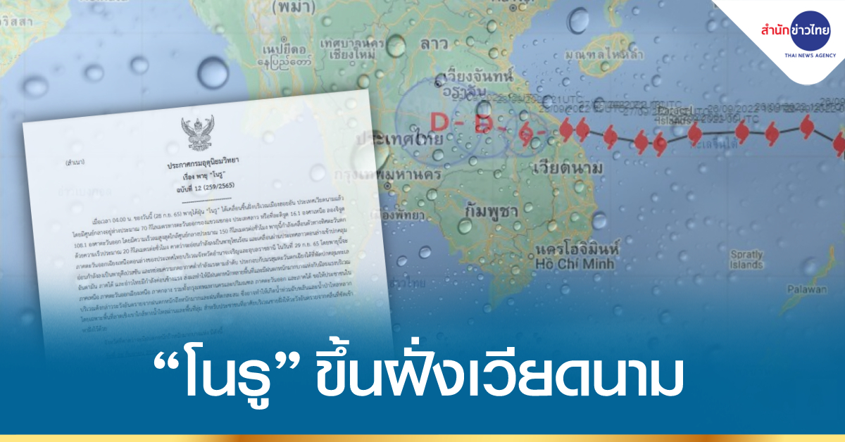 กรมอุตุนิยมวิทยา ออกประกาศ เรื่อง “พายุโนรู” ฉบับที่ 12 ลงวันที่ 28 กันยายน 2565 ระบุว่า เมื่อเวลา 04.00 น. วันนี้ (28 ก.ย.65) พายุไต้ฝุ่น “โนรู” ได้เคลื่อนขึ้นฝั่งบริเวณเมืองฮอยอัน ประเทศเวียดนามแล้ว โดยมีศูนย์กลางอยู่ห่างประมาณ 70 กิโลเมตร ทางตะวันออกของแขวงเซกอง ประเทศลาว หรือที่ละติจูด 16.1 องศาเหนือ ลองจิจูด 108.1 องศาตะวันออก โดยมีความเร็วลมสูงสุดใกล้ศูนย์กลางประมาณ 150 กิโลเมตร/ชั่วโมง พายุนี้กำลังเคลื่อนตัวทางทิศตะวันตก ด้วยความเร็วประมาณ 20 กิโลเมตร/ชั่วโมง คาดว่าจะอ่อนกำลังลงเป็นพายุโซนร้อน และเคลื่อนผ่านประเทศลาวตอนล่าง เข้าปกคลุมภาคตะวันออกเฉียงเหนือตอนล่างของประเทศไทย บริเวณ จ.อำนาจเจริญ และอุบลราชธานี ในวันที่ 29 ก.ย.65 โดยพายุนี้จะอ่อนกำลังลงเป็นพายุดีเปรสชัน และหย่อมความกดอากาศต่ำกำลังแรง ตามลำดับ ประกอบกับมรสุมตะวันตกเฉียงใต้ที่พัดปกคลุมทะเลอันดามัน ภาคใต้ และอ่าวไทย มีกำลังค่อนข้างแรง ส่งผลทำให้มีฝนตกหนักหลายพื้นที่ และมีฝนตกหนักมากบางแห่งกับมีลมแรง บริเวณภาคเหนือ ภาคตะวันออกเฉียงเหนือ ภาคกลาง รวมทั้งกรุงเทพมหานครและปริมณฑล ภาคตะวันออก และภาคใต้ ขอให้ประชาชนในบริเวณดังกล่าวระวังอันตรายจากฝนตกหนักถึงหนักมากและฝนที่ตกสะสม ซึ่งอาจทำให้เกิดน้ำท่วมฉับพลันและน้ำป่าไหลหลาก โดยเฉพาะพื้นที่ลาดเชิงเขาใกล้ทางน้ำไหลผ่านและพื้นที่ลุ่ม สำหรับประชาชนที่อาศัยบริเวณชายฝั่งให้ระวังอันตรายจากคลื่นที่ซัดเข้าหาฝั่งไว้ด้วย