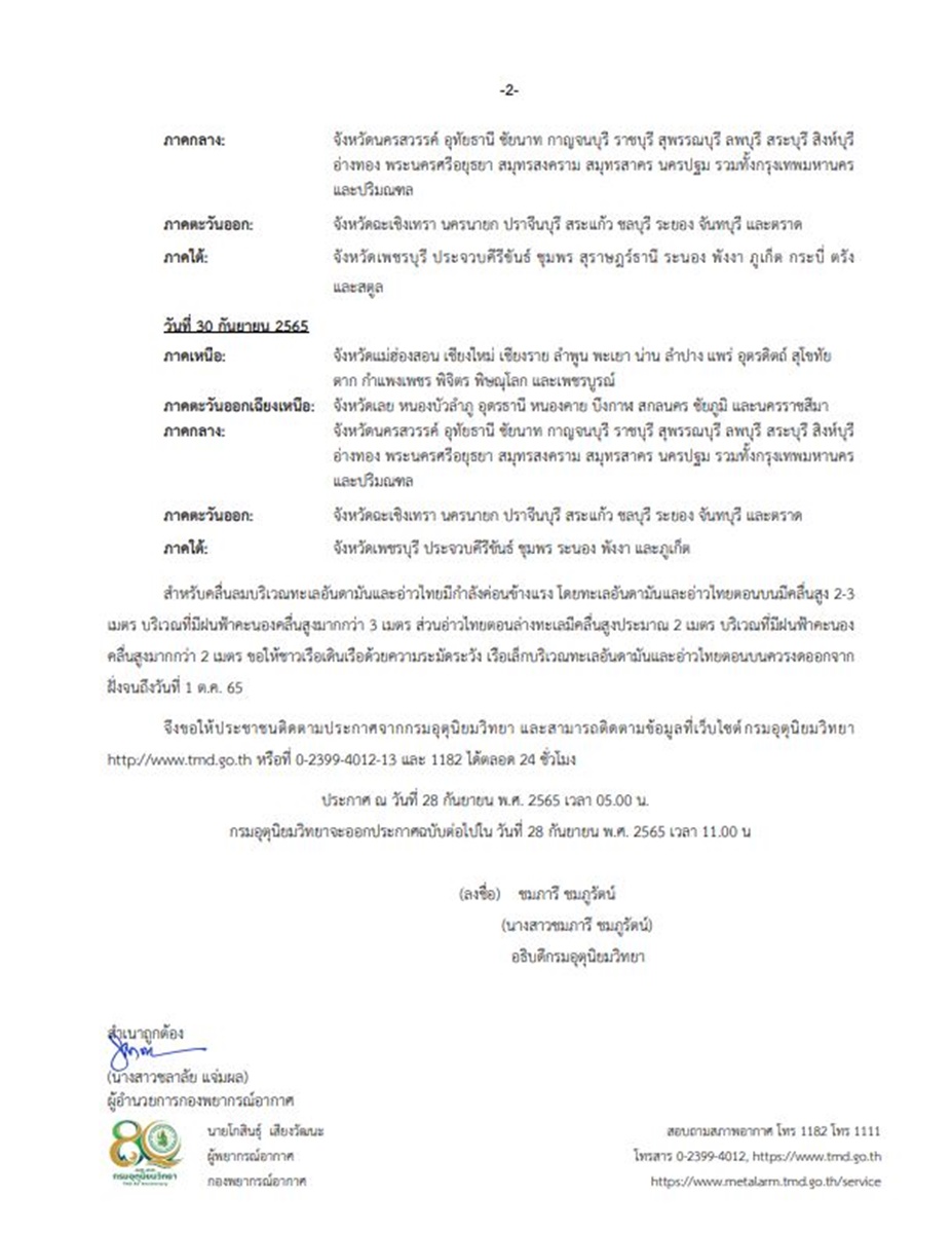 ส่วนคลื่นลมบริเวณทะเลอันดามันและอ่าวไทยมีกำลังค่อนข้างแรง โดยทะเลอันดามันและอ่าวไทยตอนบนมีคลื่นสูง 2-3 เมตร บริเวณที่มีฝนฟ้าคะนองคลื่นสูงมากกว่า 3 เมตร อ่าวไทยตอนล่างมีคลื่นสูงประมาณ 2 เมตร บริเวณที่มีฝนฟ้าคะนองคลื่นสูงมากกว่า 2 เมตร ขอให้ชาวเรือเดินเรือด้วยความระมัดระวัง เรือเล็กบริเวณทะเลอันดามันและอ่าวไทยตอนบน ควรงดออกจากฝั่งจนถึงวันที่ 1 ต.ค.65