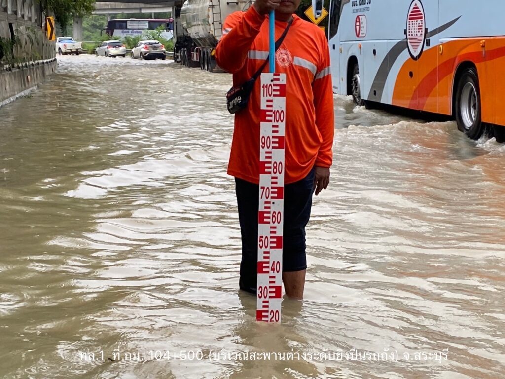 – ช่วง กม.ที่ 104+500 – 105+100 ทางขนานขาเข้า ระดับน้ำ 20-30 ซม. การจราจรผ่านได้ไม่สะดวก เจ้าหน้าที่คอยอำนวยความสะดวกด้านการจราจร