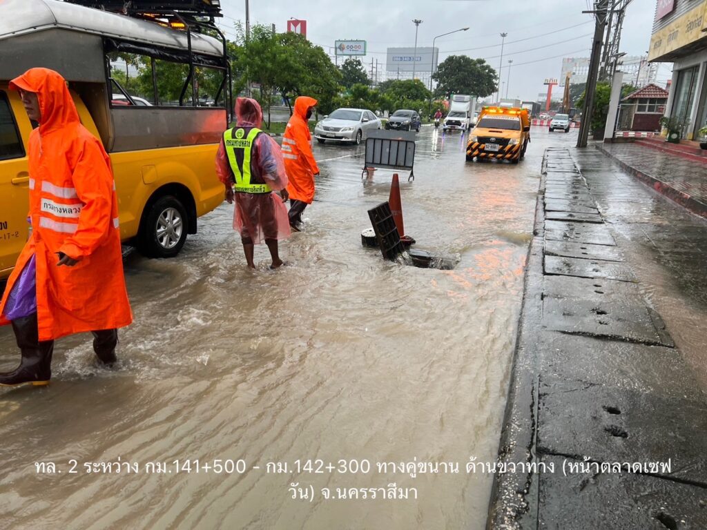 – ช่วง กม.ที่ 141+500-กม.142+300 ทางคู่ขนาน ด้านขวาทาง ระดับน้ำ 20 ซม. เจ้าหน้าที่คอยอำนวยความสะดวกด้านการจราจร