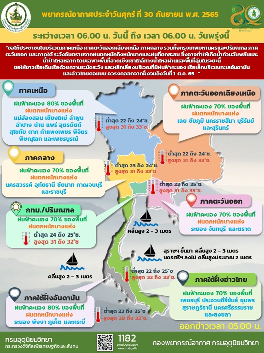 ส่วนคลื่นลมบริเวณทะเลอันดามันและอ่าวไทยมีกำลังค่อนข้างแรง โดยทะเลอันดามันตอนบนและอ่าวไทยตอนบนมีคลื่นสูง 2-3 เมตร บริเวณที่มีฝนฟ้าคะนองคลื่นสูงมากกว่า 3 เมตร ขอให้ชาวเรือเดินเรือด้วยความระมัดระวัง และหลีกเลี่ยงบริเวณที่มีฝนฟ้าคะนอง เรือเล็กบริเวณทะเลอันดามันและอ่าวไทยตอนบน ควรงดออกจากฝั่งจนถึงวันที่ 1 ต.ค.65
