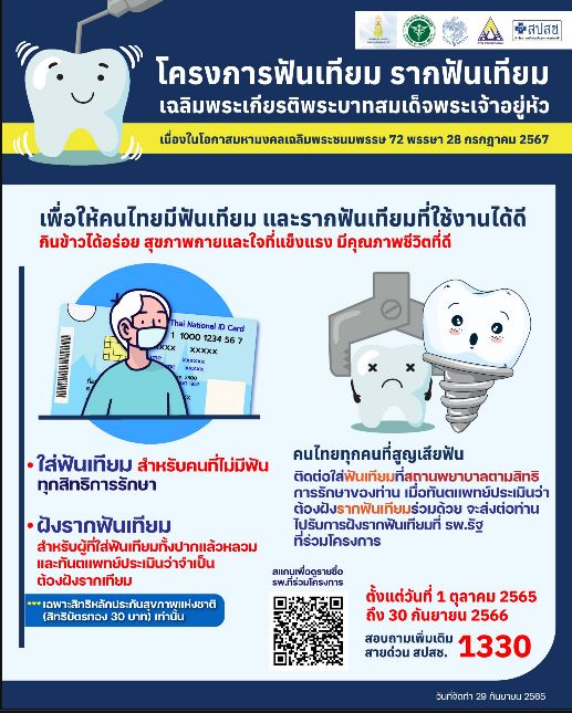 เริ่มโครงการ “ฟันเทียม รากฟันเทียม เฉลิมพระเกียรติในหลวง เนื่องในโอกาสมหามงคลเฉลิมพระชนมพรรษา 72 พรรษา” ดูแลคนไทยทุกคนที่ไม่มีฟันบดเคี้ยวอาหาร พร้อมสืบสานต่อยอดโครงการฯ เพิ่มคุณภาพชีวิตที่ดี โดยให้บริการใส่ฟันเทียมทั้งปาก หรือเกือบทั้งปาก ให้กับประชาชนทุกสิทธิ ติดต่อที่ รพ.สังกัด สธ. และ รพ.รัฐทั่วประเทศ สิทธิประกันสังคมรับบริการได้ที่ รพ.เอกชน และคลินิกทันตกรรมเอกชน ส่วนบริการฝังรากฟันเทียมกับผู้มีปัญหาฟันเทียมทั้งปากหลวมเฉพาะสิทธิบัตรทอง ที่ รพ.ที่เข้าร่วมโครงการ