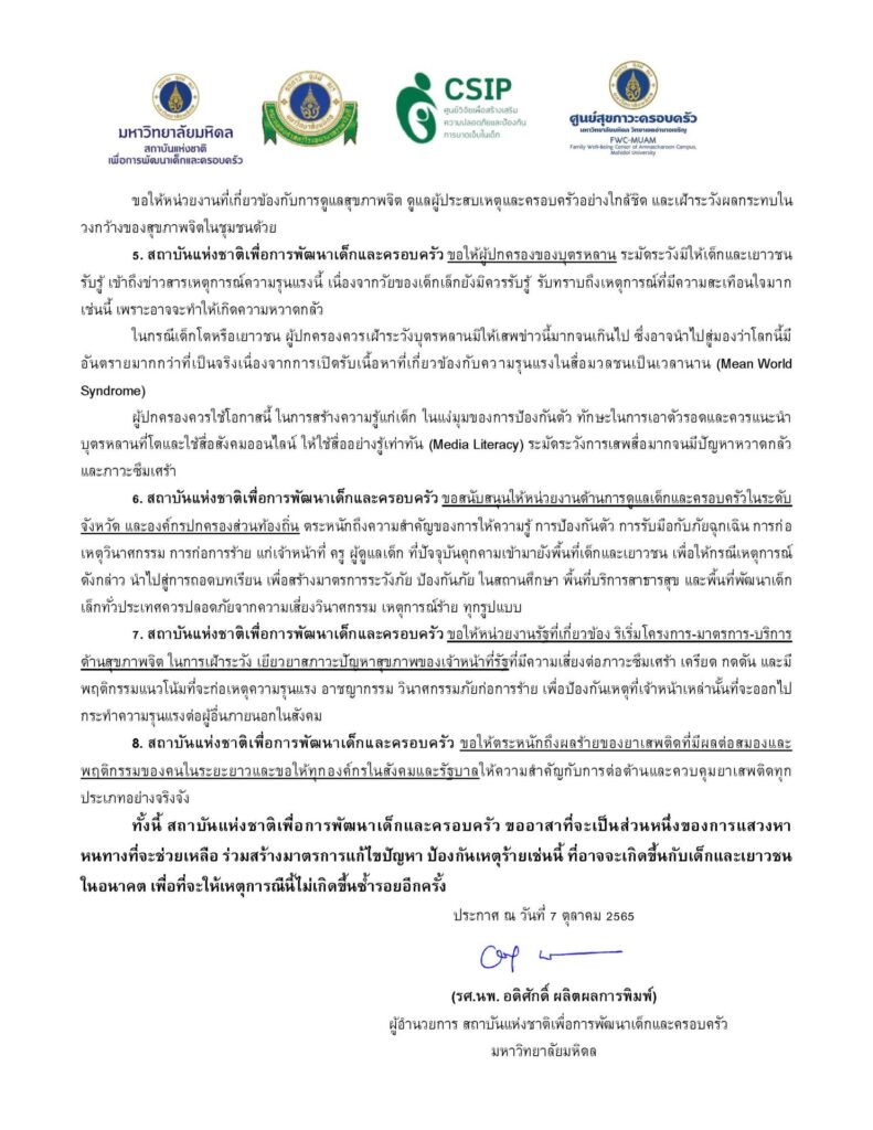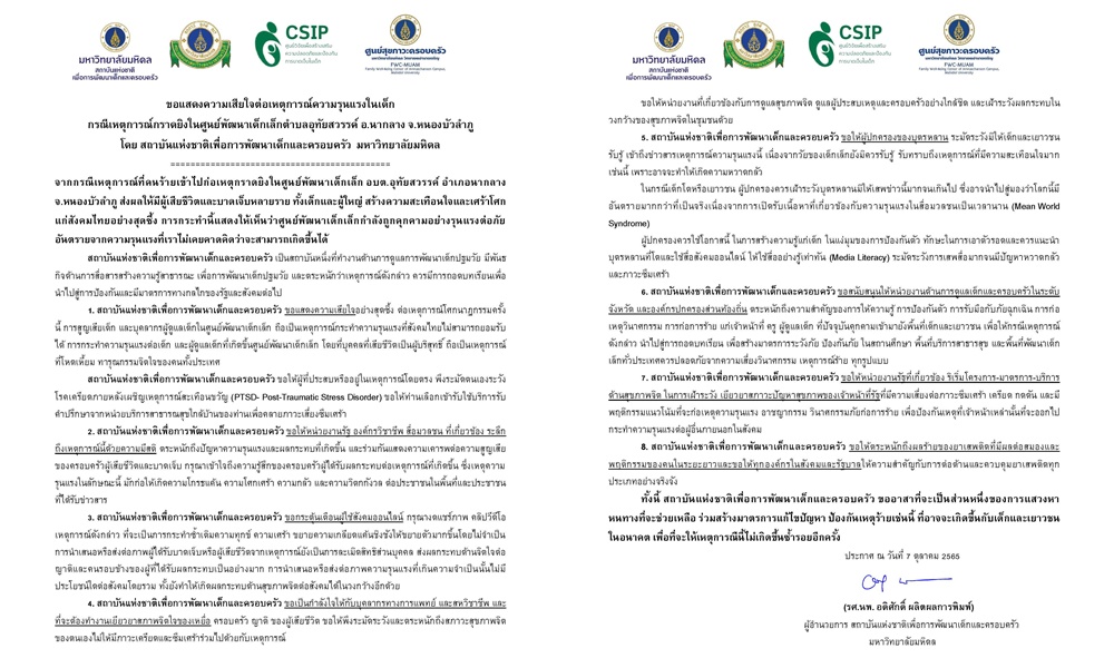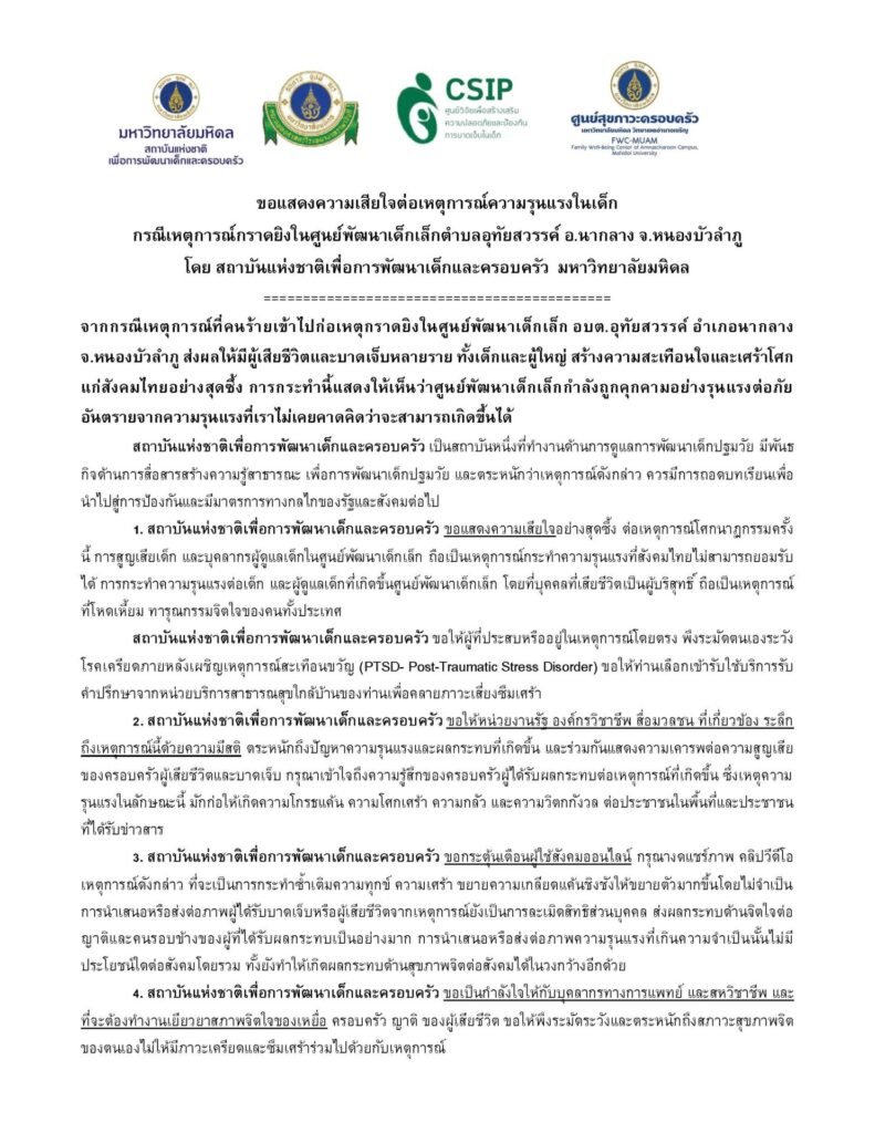 กรุงเทพฯ 7 ต.ค. – สถาบันแห่งชาติเพื่อการพัฒนาเด็กและครอบครัว มหาวิทยาลัยมหิดล ขอแสดงความเสียใจต่อเหตุการณ์ความรุนแรงในเด็ก กรณีกราดยิงในศูนย์เด็กเล็ก จ.หนองบัวลำภู