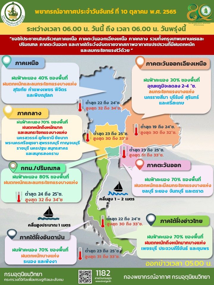 กรมอุตุนิยมวิทยา พยากรณ์อากาศ 24 ชั่วโมงข้างหน้า บริเวณความกดอากาศสูงหรือมวลอากาศเย็นกำลังปานกลางจากประเทศจีนได้แผ่ลงมาปกคลุมภาคเหนือตอนบน และภาคตะวันออกเฉียงเหนือตอนบนแล้ว ทำให้ภาคเหนือตอนบน และภาคตะวันออกเฉียงเหนือตอนบนมีฝนและอุณหภูมิลดลง ส่วนภาคเหนือตอนล่าง ภาคกลางรวมทั้งกรุงเทพมหานครและปริมณฑล และภาคตะวันออกยังคงมีฝนตกหนักถึงหนักมากกับมีลมกระโชกแรงบางแห่ง ในขณะที่ลมตะวันออกพัดปกคลุมอ่าวไทยและภาคใต้ ทำให้ภาคใต้มีฝนตกหนักถึงหนักมากบางแห่ง ขอให้ประชาชนบริเวณดังกล่าวระวังอันตรายจากสภาพอากาศแปรปรวนที่มีฝนตกหนักและลมกระโชกแรงไว้ด้วย ส่วนคลื่มลมบริเวณอ่าวไทยมีคลื่นสูง 1-2 เมตร และบริเวณที่มีฝนฟ้าคะนองคลื่นสูงประมาณ 2 เมตร โดยในวันนี้ (10 ต.ค. 65) ถึงวันที่ 14 ต.ค. 2565 อุณหภูมิจะลดลง 3–5 องศาเซลเซียสกับมีลมแรงในภาคตะวันออกเฉียงเหนือ ส่วนภาคเหนือ ภาคกลาง ภาคตะวันออกอุณหภูมิจะลดลง 1-3 องศาเซลเซียส