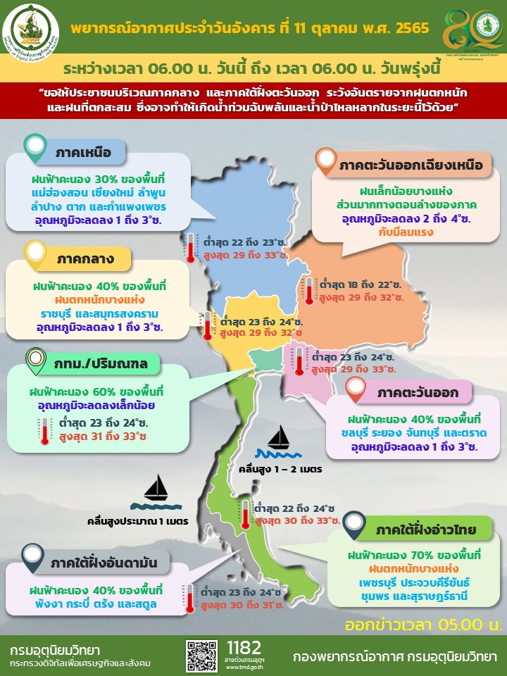บริเวณความกดอากาศสูงหรือมวลอากาศเย็นกำลังปานกลางแผ่ปกคลุมประเทศไทยตอนบน ทำให้บริเวณดังกล่าวอุณหภูมิลดลงกับมีลมแรง โดยภาคตะวันออกเฉียงเหนืออุณหภูมิจะลดลง 2-4 องศาเซลเซียส ส่วนภาคเหนือ ภาคกลาง และภาคตะวันออก อุณหภูมิจะลดลง 1-3 องศาเซลเซียส สำหรับภาคกลางตอนล่างยังคงมีฝนตกหนักบางแห่งเกิดขึ้นในวันที่ 11 ตุลาคม 2565 ขอให้ประชาชนระวังอันตรายจากสภาพอากาศแปรปรวนที่มีฝนตกหนัก ลมกระโชกแรง และอุณหภูมิลดลง รวมถึงดูแลสุขภาพไว้ด้วย สำหรับร่องมรสุมที่พาดผ่านภาคใต้ตอนกลางทำให้ภาคใต้มีฝนตกหนักถึงหนักมากในระยะนี้
