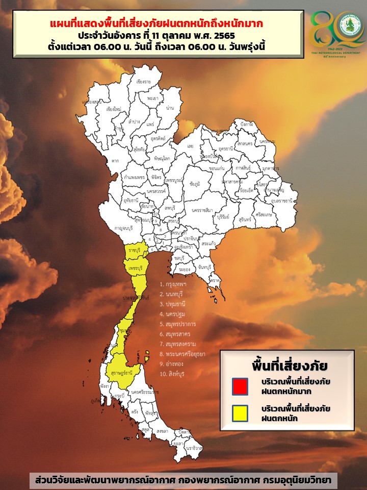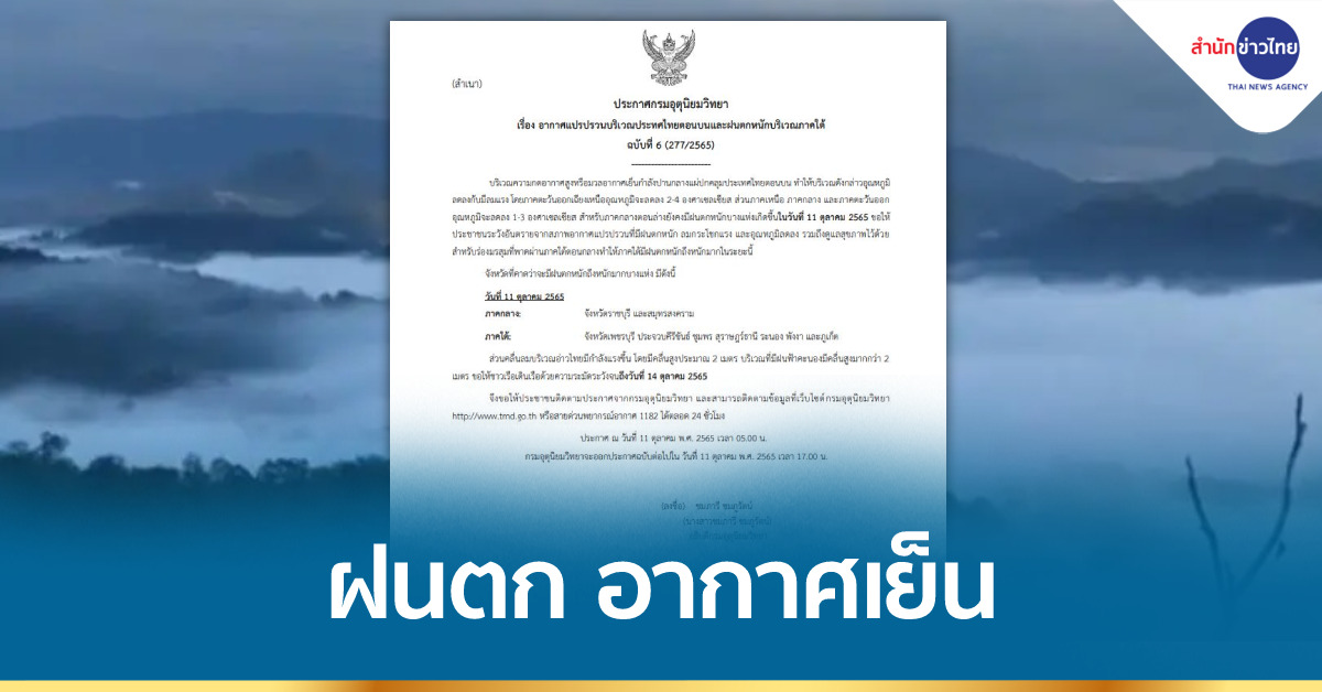 ประกาศกรมอุตุนิยมวิทยา “อากาศแปรปรวนบริเวณประเทศไทยตอนบนและฝนตกหนักบริเวณภาคใต้” ฉบับที่ 6 ลงวันที่ 11 ตุลาคม 2565