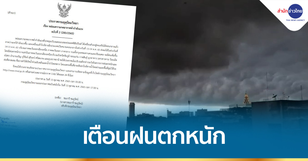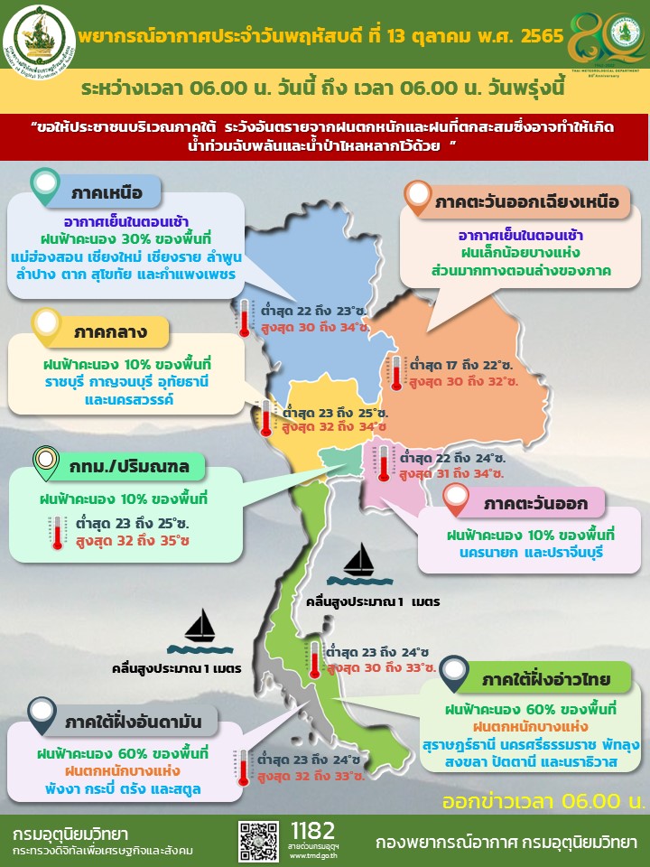 หย่อมความกดอากาศต่ำกำลังแรงที่ปกคลุมบริเวณตอนบนของประเทศฟิลิปปินส์ ได้เคลื่อนตัวลงสู่ทะเลจีนใต้ตอนกลางแล้ว คาดว่าจะทวีกำลังแรงขึ้น และเคลื่อนเข้าใกล้ชายฝั่งประเทศเวียดนามตอนกลางในช่วงวันที่ 13-14 ต.ค. 65 ส่งผลให้ในช่วงวันที่ 14-15 ต.ค. 65 บริเวณภาคตะวันออกเฉียงเหนือ ภาคตะวันออก ภาคกลาง รวมทั้งกรุงเทพมหานครและปริมณฑล จะมีฝนเพิ่มขึ้น โดยมีฝนตกหนักบางแห่งในภาคตะวันออกเฉียงเหนือบริเวณจังหวัดชัยภูมิ ขอนแก่น กาฬสินธุ์ มุกดาหาร มหาสารคาม ร้อยเอ็ด ยโสธร อำนาจเจริญ บุรีรัมย์ สุรินทร์ ศรีสะเกษ และอุบลราชธานี ขอให้ประชาชนในบริเวณดังกล่าวระวังอันตรายจากฝนตกหนักและฝนที่ตกสะสม ซึ่งอาจทำให้เกิดน้ำท่วมฉับพลันและน้ำป่าไหลหลาก โดยเฉพาะพื้นที่ลาดเชิงเขาใกล้ทางน้ำไหลผ่านและพื้นที่ลุ่มไว้ด้วย