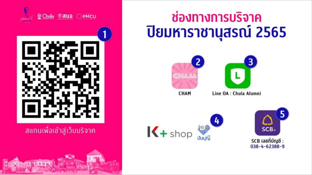 ดังนั้นจึงเชิญชาวจุฬาฯ และประชาชนไทยสนับสนุนกิจกรรมสาธารณกุศลของสมาคมนิสิตเก่าจุฬาฯ ด้วยการร่วมบริจาคได้ตั้งแต่บัดนี้ ผ่าน 5 ช่องทาง