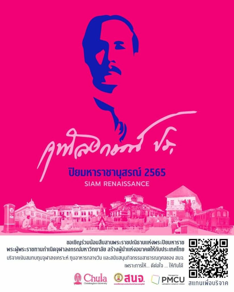 กรุงเทพฯ 13 ต.ค. – สมาคมนิสิตเก่าจุฬาลงกรณ์มหาวิทยาลัยจัดงาน “ปิยมหาราชานุสรณ์ 2565” เพื่อน้อมรำลึกในพระมหากรุณาธิคุณสมเด็จพระปิยมหาราช ปีนี้จัดขึ้นภายใต้แนวคิด “Siam Renaissance” ถ่ายทอดพระราชกรณียกิจที่ทรงวางรากฐานและพระราชทานกำเนิดกิจการต่างๆ จนรุ่งเรืองจวบจนถึงปัจจุบัน