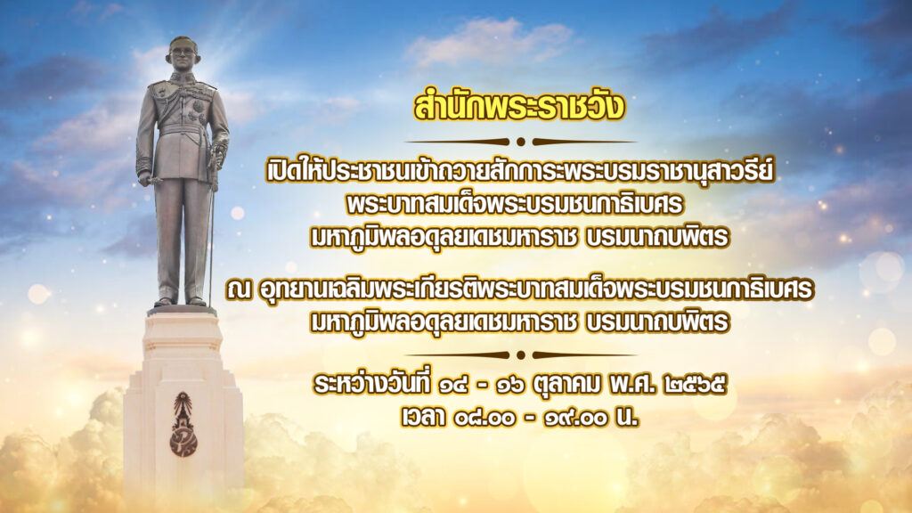 สำหรับอุทยานเฉลิมพระเกียรติ พระบาทสมเด็จพระบรมชนกาธิเบศร มหาภูมิพลอดุลยเดชมหาราช บรมนาถบพิตร ทางสำนักพระราชวัง เปิดโอกาสให้พี่น้องประชาชนที่มีความประสงค์จะเข้าถวายสักการะพระบรมราชานุสาวรีย์ เข้าถวายสักการะได้ในระหว่างวันที่ 14-16 ตุลาคมนี้ ตั้งแต่เวลา 08.00-19.00 น. ก่อนจะปิดเพื่อปรับภูมิทัศน์ของอุทยานเฉลิมพระเกียรติฯ ให้เสร็จสมบูรณ์ เพื่อให้สมพระเกียรติ และเกิดประโยชน์สูงสุดแก่พี่น้องประชาชนต่อไป
