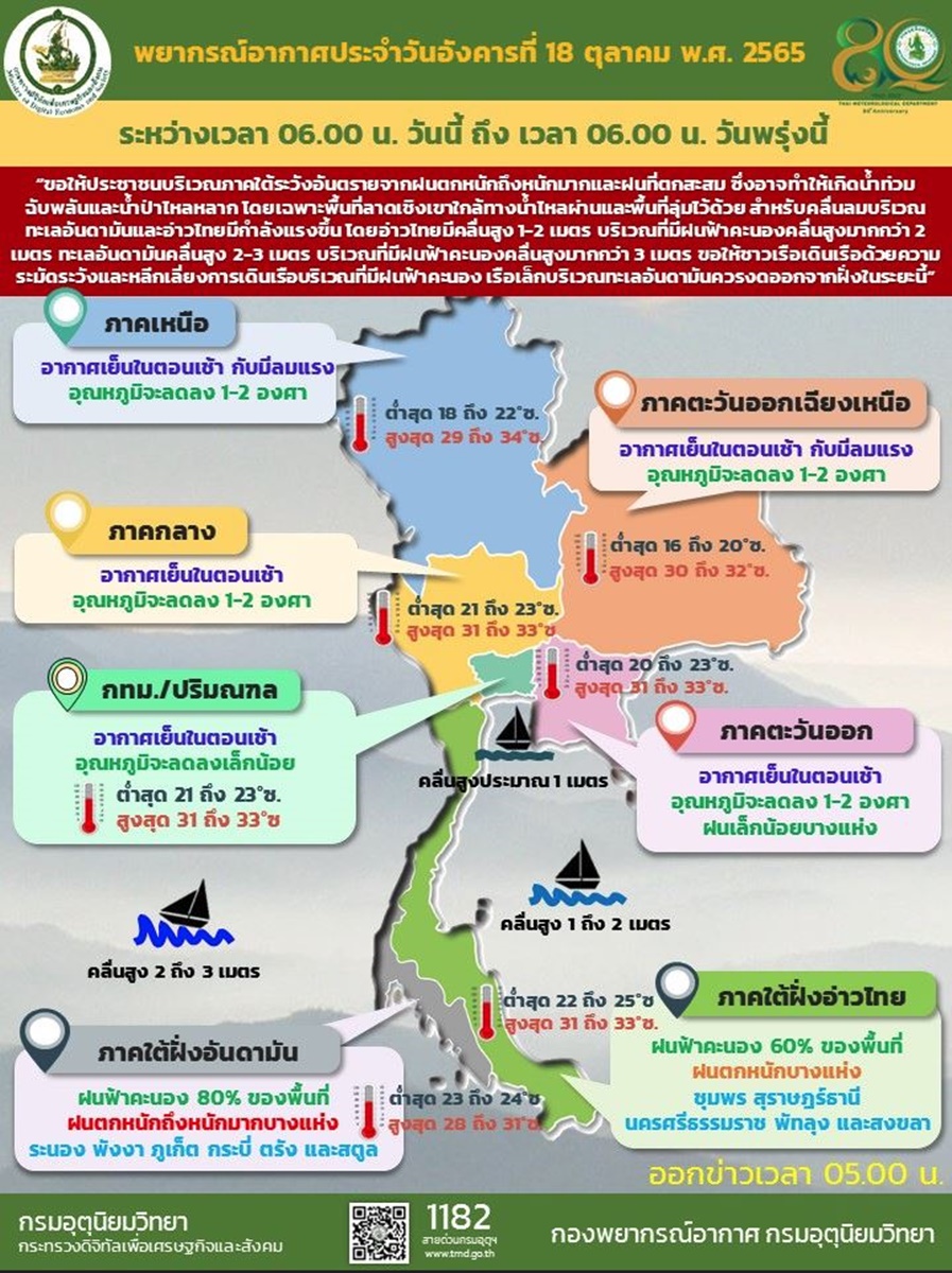 กรมอุตุฯ 18 ต.ค. – กรมอุตุฯ เผยไทยตอนบนอากาศเย็น ลมแรง อุณหภูมิลดลง 1-2 องศาฯ โดยมีฝนเล็กน้อยบางแห่งในภาคตะวันออก ขณะที่ภาคใต้มีฝนตกต่อเนื่องและตกหนักถึงหนักมากบางแห่ง