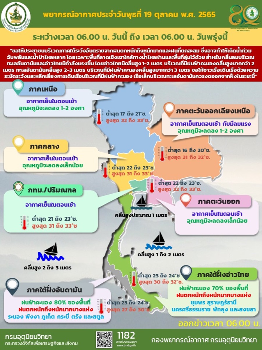 กรมอุตุฯ 19 ต.ค. – กรมอุตุฯ เผยไทยตอนบนอากาศเย็น อุณหภูมิลดลง 1-2 องศาฯ ส่วนภาคใต้มีฝนตกต่อเนื่องและตกหนักถึงหนักมากบางแห่ง กทม.อากาศเย็นในตอนเช้า ขณะที่พายุไต้ฝุ่น “เนสาท” จ่อเคลื่อนเข้าอ่าวตังเกี๋ยและเวียดนามตอนบน คาดจะอ่อนกำลังลงตามลำดับอย่างรวดเร็ว