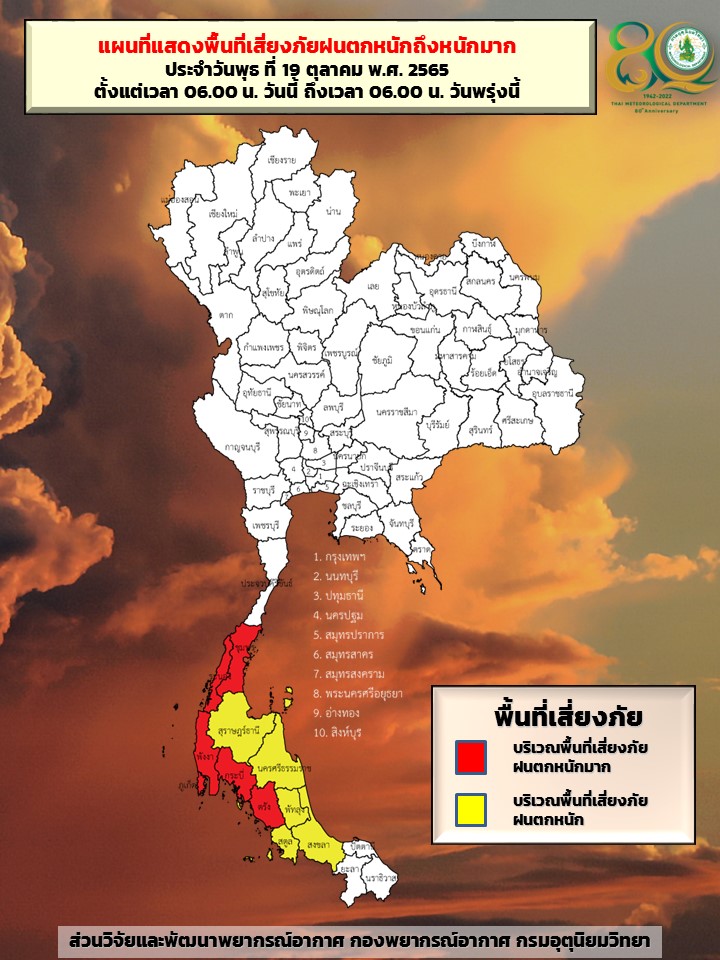 กรมอุตุนิยมวิทยา พยากรณ์อากาศ 24 ชั่วโมง บริเวณความกดอากาศสูงหรือมวลอากาศเย็นกำลังปานกลางจากประเทศจีนยังคงปกคลุมประเทศไทยตอนบนและทะเลจีนใต้ ลักษณะเช่นนี้ทำให้ประเทศไทยตอนบนมีอากาศเย็น และอุณหภูมิจะลดลง 1-2 องศาเซลเซียส สำหรับร่องมรสุมยังคงพาดผ่านภาคใต้ตอนกลาง ประกอบกับมีหย่อมความกดอากาศต่ำกำลังแรงปกคลุมบริเวณทะเลอันดามันตอนกลาง ในขณะที่ลมตะวันตกเฉียงใต้ที่พัดปกคลุมทะเลอันดามันและภาคใต้มีกำลังแรงขึ้น ทำให้ภาคใต้มีฝนตกต่อเนื่อง และมีฝนตกหนักถึงหนักมากบางแห่ง ขอให้ประชาชนบริเวณภาคใต้ระวังอันตรายจากฝนตกหนักถึงหนักมากและฝนที่ตกสะสม ซึ่งอาจทำให้เกิดน้ำท่วมฉับพลันและน้ำป่าไหลหลาก โดยเฉพาะพื้นที่ลาดเชิงเขาใกล้ทางน้ำไหลผ่านและพื้นที่ลุ่ม