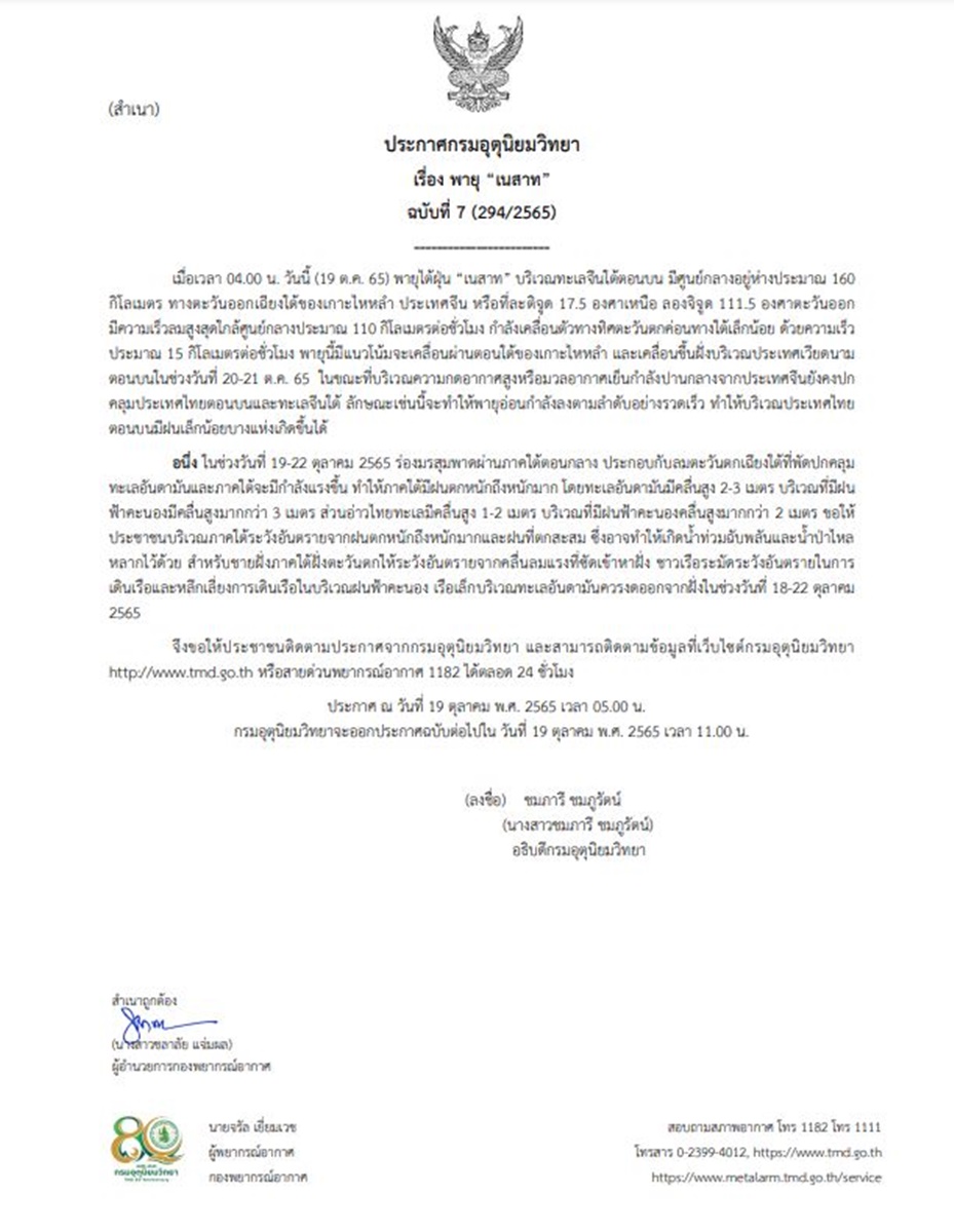 อนึ่ง พายุไต้ฝุ่น “เนสาท” บริเวณทะเลจีนใต้ตอนบน มีศูนย์กลางอยู่ห่างประมาณ 160 กิโลเมตร ทางตะวันออกเฉียงใต้ของเกาะไหหลำ ประเทศจีน คาดว่าพายุนี้จะเคลื่อนผ่านตอนใต้ของเกาะไหหลำ และเคลื่อนเข้าบริเวณอ่าวตังเกี๋ยและประเทศเวียดนามตอนบน ในช่วงวันที่ 20-21 ต.ค.65 ขณะที่บริเวณความกดอากาศสูงหรือมวลอากาศเย็นกำลังปานกลางยังคงปกคลุมประเทศไทยตอนบนและทะเลจีนใต้ ลักษณะเช่นนี้จะทำให้พายุอ่อนกำลังลงตามลำดับอย่างรวดเร็ว ทำให้ประเทศไทยตอนบนมีฝนเล็กน้อยบางแห่ง