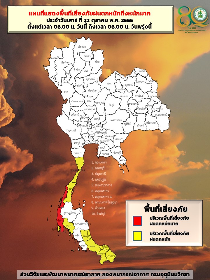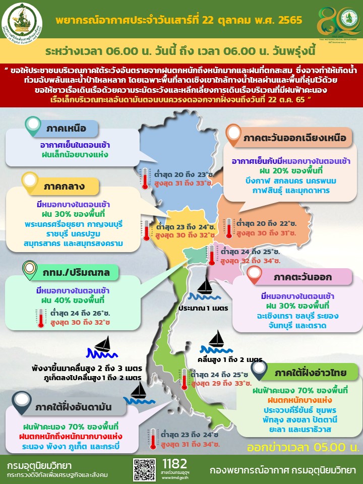กรมอุตุนิยมวิทยา เผยร่องมรสุมพาดผ่านภาคใต้ตอนกลาง ประกอบกับมีหย่อมความกดอากาศต่ำกำลังแรงปกคลุมทะเลอันดามันตอนกลาง ในขณะที่ลมตะวันตกเฉียงใต้กำลังแรงที่พัดปกคลุมทะเลอันดามันตอนบน ส่วนลมตะวันออกพักปกคุลมอ่าวไทยและภาคใต้ ทำให้ภาคใต้มีฝนตกหนักถึงหนักมากบางแห่ง ขอให้ประชาชนบริเวณภาคใต้ระวังอันตรายจากฝนตกหนักถึงหนักมากและฝนที่ตกสะสม ซึ่งอาจทำให้เกิดน้ำท่วมฉับพลันและน้ำป่าไหลหลาก โดยเฉพาะพื้นที่ลาดเชิงเขาใกล้ทางน้ำไหลผ่านและพื้นที่ลุ่มไว้ด้วย ส่วนคลื่นลมบริเวณทะเลอันดามันตอนบนคลื่นสูง 2-3 เมตร บริเวณที่มีฝนฟ้าคะนองคลื่นสูงมากกว่า 3 เมตร ส่วนทะเลอันดามันตอนล่างและอ่าวไทยมีคลื่นสูง 1-2 เมตร บริเวณที่มีฝนฟ้าคะนองคลื่นสูงมากกว่า 2 เมตร ขอให้ชาวเรือเดินเรือด้วยความระมัดระวังและหลีกเลี่ยงการเดินเรือบริเวณที่มีฝนฟ้าคะนอง เรือเล็กบริเวณทะเลอันดามันตอนบนควรงดออกจากฝั่งจนถึงวันที่ 22 ต.ค. 65