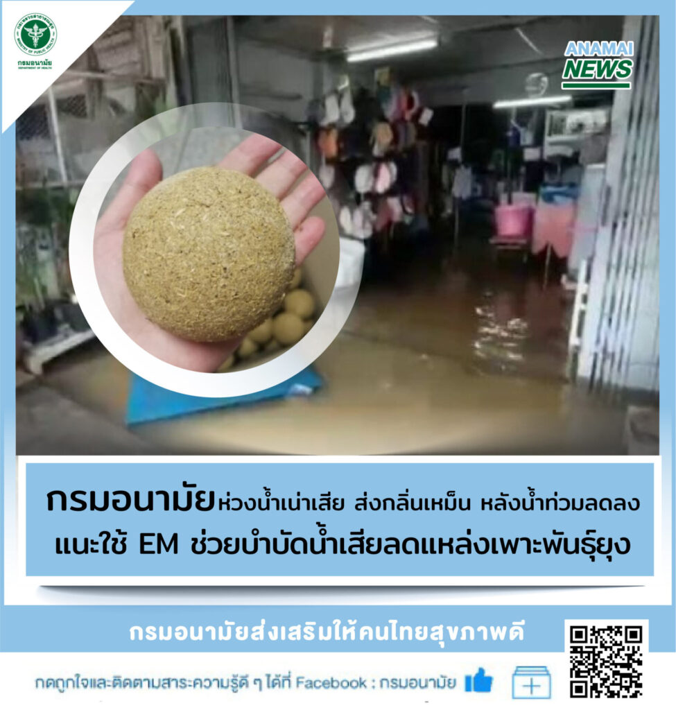 ยังประสบปัญหาน้ำท่วมขังบริเวณอาคาร บ้านเรือน และตลาด ทำให้เกิดน้ำเน่าเสีย ส่งกลิ่นเหม็น และเป็นแหล่งเพาะพันธุ์ของเชื้อโรค และยุง ซึ่งอาจก่อให้เกิดภาวะเจ็บป่วยกับประชาชน เพื่อแก้ไขปัญหาดังกล่าว แนะนำให้นำ EM (Effective Microorganisms) หรือจุลินทรีย์ที่มีประสิทธิภาพ มาใช้ป้องกันและบรรเทาสถานการณ์ปัญหาน้ำเน่าในพื้นที่เบื้องต้นก่อน ซึ่งอาจเลือกใช้ได้ทั้ง EM ball และ EM น้ำ ขึ้นอยู่กับความเหมาะสม เพื่อไม่ให้น้ำที่ท่วมขังเกิดการเน่าเสีย และสามารถลดกลิ่นเหม็น รวมทั้งลดแหล่งเพาะพันธุ์ยุงได้