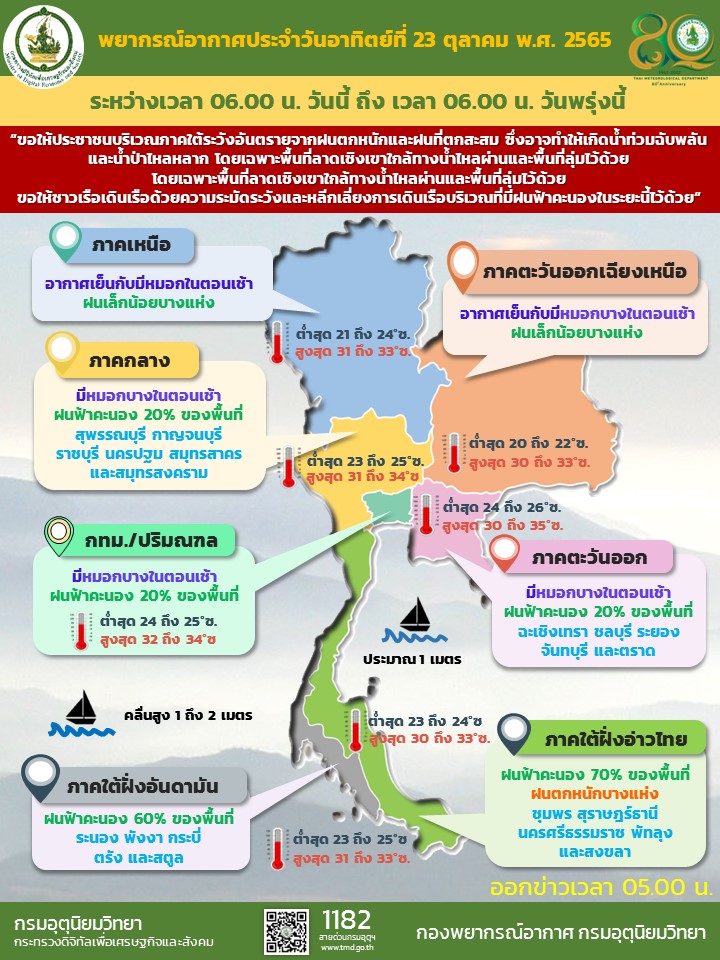 กทม. 23 ต.ค.- กรมอุตุฯ เผยภาคใต้ยังมีฝนตกต่อเนื่อง ระวังน้ำท่วมฉับพลัน น้ำป่าไหลหลาก ส่วนไทยตอนบนฝนลดลง อากาศเย็นกับมีหมอกบางตอนเช้า