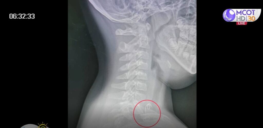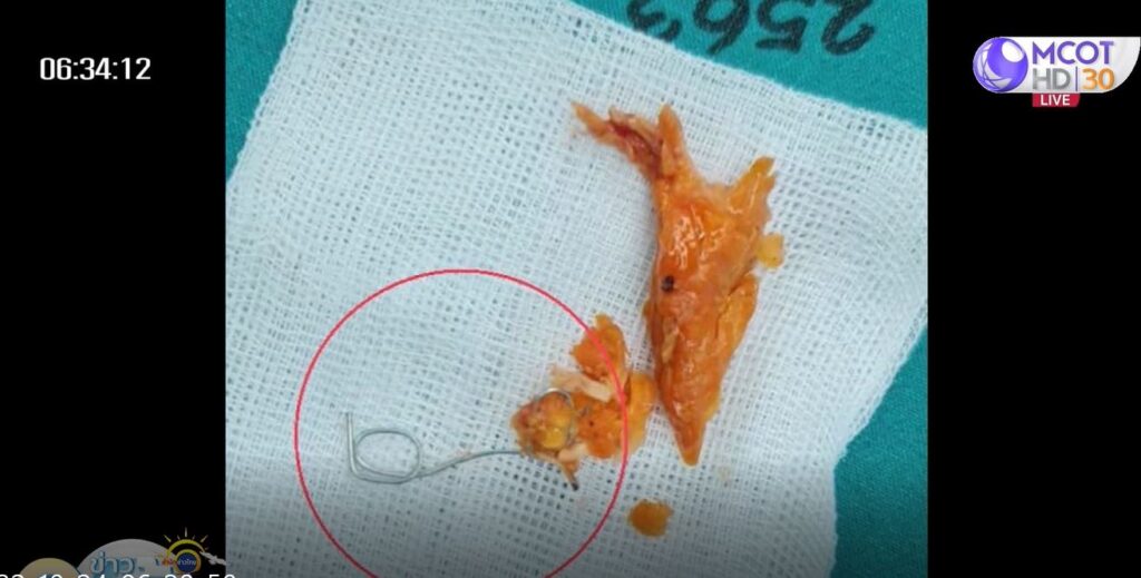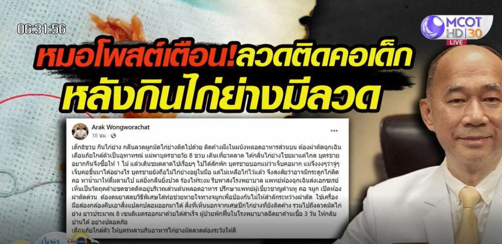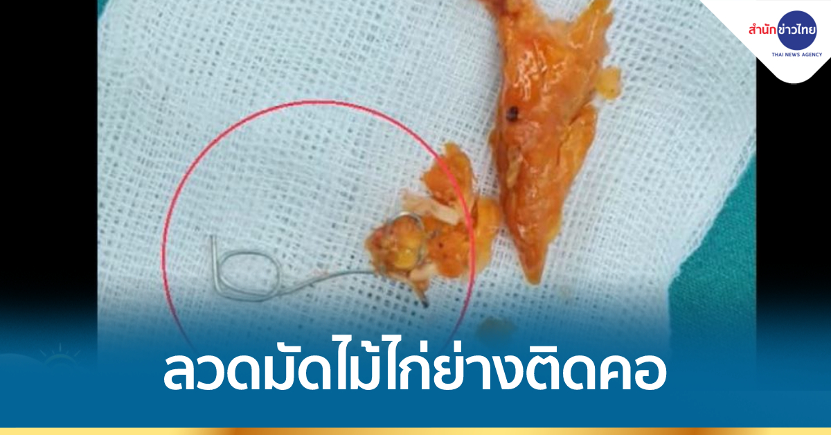 24 ต.ค. – อุทาหรณ์! เด็ก 8 ขวบ กินไก่ย่าง เผลอกลืนลวดมัดไม้หนีบไก่ย่างฝังในผนังหลอดอาหารส่วนบน ต้องผ่าตัดด่วน หมอเตือนให้บุตรหลานกินอาหารไก่ย่างมัดลวดต้องระวังให้ดี