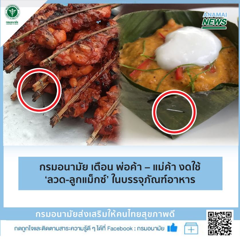 นพ.อรรถพล แก้วสัมฤทธิ์ รองอธิบดีกรมอนามัย เปิดเผยว่าจากกรณีที่มีการโพสต์เตือนเด็ก 8 ขวบ กินไก่ย่างกลืนลวดมัดปลายไม้ไก่ย่าง โดยไม่รู้ตัว ส่งผลให้เกิดอาการเจ็บคอ โชคดีที่ผู้ปกครองนำเข้าห้องฉุกเฉิน และแพทย์ผู้เชี่ยวชาญใช้เครื่องมือส่องกล้องคีบนำลวดออกมาได้อย่างปลอดภัยนั้น กรมอนามัยจึงขอแจ้งเตือนพ่อค้า แม่ค้า ผู้จำหน่ายอาหารห้ามนำลวด หรือลูกแม็กซ์ มาใช้ในการบรรจุอาหาร เพื่อความปลอดภัยของผู้บริโภค โดยเฉพาะลวดมัดปลายไม้ไก่ย่าง เพราะเมื่อโดนความร้อนเป็นเวลานานอาจมีสารปนเปื้อนได้ ควรใช้วัสดุที่มองเห็นได้ชัดเจน หรือเปลี่ยนเป็นบรรจุภัณฑ์ที่สามารถปิดล็อคได้ทันที และควรเลือกใช้ภาชนะบรรจุอาหารที่เหมาะสม หรือ Food Grade รวมถึงผู้ประกอบการและผู้สัมผัสอาหาร ต้องผ่านการอบรมตามกฎหมายด้วย ดังนั้นเพื่อความปลอดภัยประชาชนควรหลีกเลี่ยงการเลือกซื้ออาหารที่มีลวดหรือลูกแม็กซ์ในบรรจุภัณฑ์อาหาร เพราะอาจเผลอเคี้ยวหรือกลืนเข้าไปได้