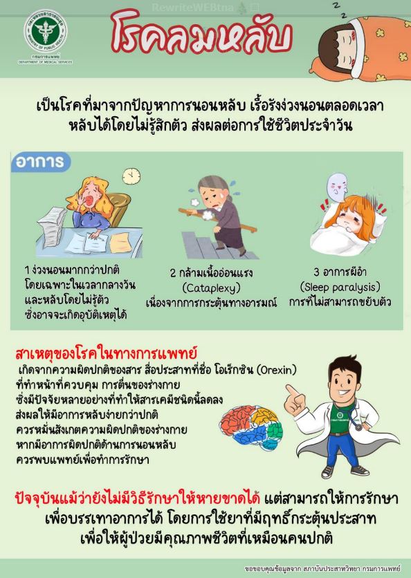 นพ.วีรวุฒิ อิ่มสำราญ รองอธิบดีกรมการแพทย์ เปิดเผยว่า โรคลมหลับ หรือ Narcolepsy เป็นโรคเกี่ยวกับการนอนหลับที่เกิดขึ้นแบบเรื้อรัง ผู้ป่วยมักจะมีอาการง่วงมากในตอนกลางวัน แม้ว่าตอนกลางคืนจะนอนหลับสนิทอย่างเพียงพอและบางครั้งพบว่ามีการนอนหลับเกิดขึ้นในสถานการณ์ไม่เหมาะสม เช่น เกิดขึ้นขณะพูดคุยกับบุคคลอื่น ขณะรับประทานอาหาร ทำงาน เรียน เล่นเกม หรือขับรถ อาจเกิดอันตรายได้ สาเหตุของโรคในทางการแพทย์ ยังไม่ทราบสาเหตุที่แน่ชัด แต่เกิดจากความผิดปกติของสารสื่อประสาทที่ชื่อ โอเร็กซิน (Orexin) ที่ทำหน้าที่ควบคุมการตื่นของร่างกาย ซึ่งมีปัจจัยหลายอย่างที่ทำให้สารเคมีชนิดนี้ลดลง ส่งผลให้มีอาการหลับง่ายกว่าปกติ ควรหมั่นสังเกตความผิดปกติของร่างกาย หากมีอาการผิดปกติด้านการนอนหลับ ควรพบแพทย์เพื่อทำการรักษา หากไม่ได้รับการรักษาที่เหมาะสมอาจจะมีคุณภาพชีวิตที่แย่ลงได้