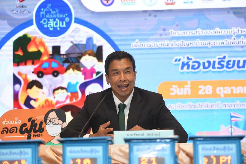 นายชัชชาติ สิทธิพันธุ์ ผู้ว่าฯ กทม. ร่วมเปิดโครงการห้องเรียนสู้ฝุ่นในพื้นที่กรุงเทพมหานคร โดยสำนักงานกองทุนสนับสนุนการสร้างเสริมสุขภาพ (สสส.) ร่วมกับ กทม.และภาคีเครือข่าย ได้แก่ กรมอนามัย กรมควบคุมมลพิษ สำนักงานพัฒนาเทคโนโลยีอวกาศและภูมิสารสนเทศ (องค์การมหาชน) ศูนย์เตรียมความพร้อมป้องกันภัยพิบัติแห่งเอเชีย (ADPC) สำนักการศึกษา และห้างหุ้นส่วนจำกัด เติมเต็มวิสาหกิจเพื่อสังคม และหน่วยงานที่้เกี่ยวข้อง จัดกิจกรรมเปิดตัวและอบรมเชิงปฏิบัติการ “โครงการห้องเรียนสู้ฝุ่นในพื้นที่กรุงเทพมหานคร” เพื่อรับมือสถานการณ์ฝุ่นละอองขนาดเล็ก (PM2.5) โดยมีโรงเรียนในสังกัดกรุงเทพมหานคร 33 โรงเรียน และโรงเรียนสังกัดสำนักงานคณะกรรมการส่งเสริมการศึกษาเอกชน 1 โรงเรียน เข้าร่วม รวม 34 โรงเรียน