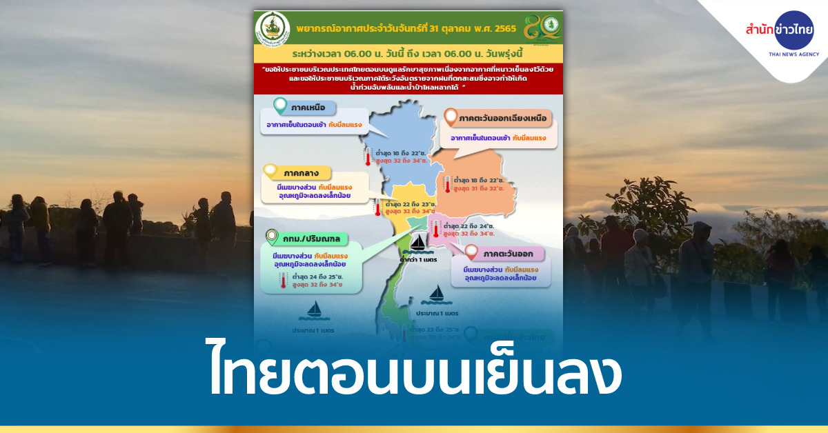 กรมอุตุนิยมวิทยา พยากรณ์อากาศ 24 ชั่วโมง บริเวณความกดอากาศสูงหรือมวลอากาศเย็นกำลังปานกลางจากประเทศจีนยังคงปกคลุมภาคเหนือตอนบน ภาคตะวันออกเฉียงเหนือตอนบน และทะเลจีนใต้ ลักษณะเช่นนี้ทำให้ประเทศไทยตอนบนอุณหภูมิลดลงเล็กน้อย โดยภาคเหนือ และภาคตะวันออกเฉียงเหนือ มีอากาศเย็นในตอนเช้ากับมีลมแรง ขอให้ประชาชนบริเวณประเทศไทยตอนบนดูแลรักษาสุขภาพเนื่องจากอากาศที่หนาวเย็นลงไว้ด้วย สำหรับมรสุมตะวันออกเฉียงเหนือพัดปกคลุมอ่าวไทย ภาคใต้ และทะเลอันดามัน ประกอบกับร่องมรสุมยังคงพาดผ่านภาคใต้ตอนล่าง ทำให้บริเวณดังกล่าวยังคงมีฝนฟ้าคะนองเกิดขึ้นต่อเนื่อง กับมีฝนตกหนักบางแห่งในระยะนี้ ขอให้ประชาชนบริเวณภาคใต้ระวังอันตรายจากฝนที่ตกสะสมซึ่งอาจทำให้เกิดน้ำท่วมฉับพลันและน้ำป่าไหลหลากได้ อนึ่ง พายุโซนร้อนกำลังแรง “นัลแก” บริเวณทะเลจีนใต้ตอนบนมีแนวโน้มจะเคลื่อนตัวเข้าใกล้ชายฝั่งมณฑลกวางตุ้งประเทศจีนในช่วงวันที่ 2-3 พ.ย. 65 โดยพายุนี้ไม่ส่งผลกระทบโดยตรงต่อลักษณะอากาศของประเทศไทย