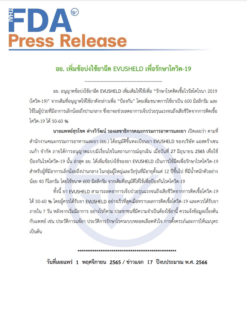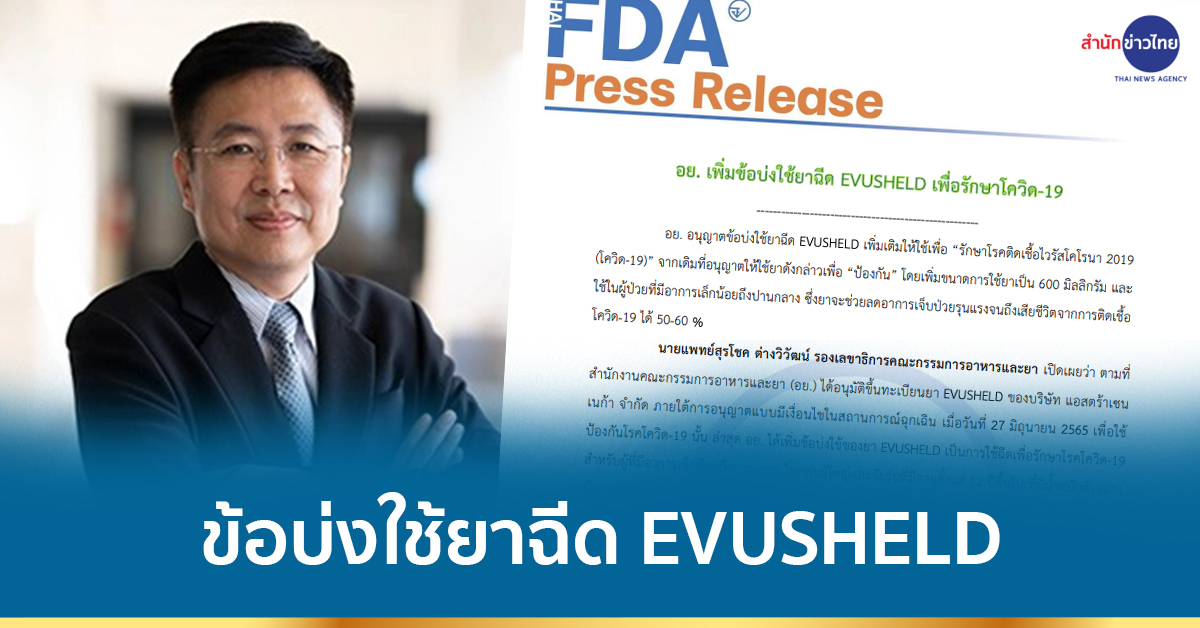 นายแพทย์สุรโชค ต่างวิวัฒน์ รองเลขาธิการคณะกรรมการอาหารและยา เปิดเผยว่า ตามที่สำนักงานคณะกรรมการอาหารและยา (อย.) ได้อนุมัติขึ้นทะเบียนยา EVUSHELD ของบริษัท แอสตร้าเซนเนก้า จำกัด ภายใต้การอนุญาตแบบมีเงื่อนไขในสถานการณ์ฉุกเฉิน เมื่อวันที่ 27 มิถุนายน 2565 เพื่อใช้ป้องกันโรคโควิด-19 นั้น ล่าสุด อย. ได้เพิ่มข้อบ่งใช้ของยา EVUSHELD เป็นการใช้ฉีดเพื่อรักษาโรคโควิด-19 สำหรับผู้ที่มีอาการเล็กน้อยถึงปานกลาง ในกลุ่มผู้ใหญ่และวัยรุ่นที่มีอายุตั้งแต่ 12 ปีขึ้นไป ที่มีน้ำหนักตัวอย่างน้อย 40 กิโลกรัม โดยใช้ขนาด 600 มิลลิกรัม จากเดิมที่อนุมัติให้ใช้เพื่อป้องกันโรคโควิด-19