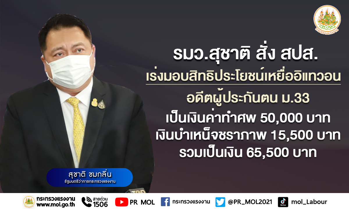 กทม. 1 พ.ย.- “สุชาติ” รมว.แรงงาน สั่ง สปส. เร่งมอบสิทธิประโยชน์เหยื่ออิแทวอน อดีตผู้ประกันตน ม.33