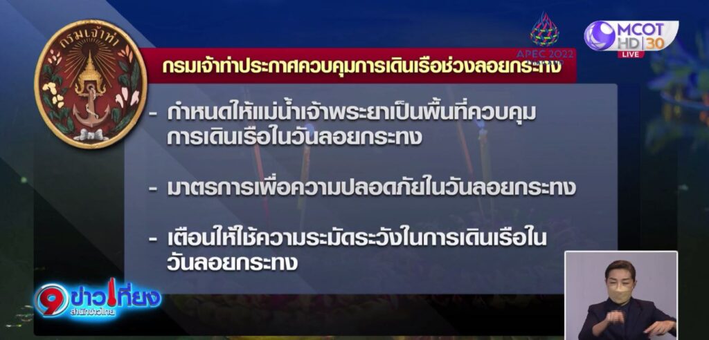 - ประกาศ เรื่องกําหนดให้แม่น้ำเจ้าพระยาเป็นพื้นที่ควบคุมการเดินเรือในวันลอยกระทง