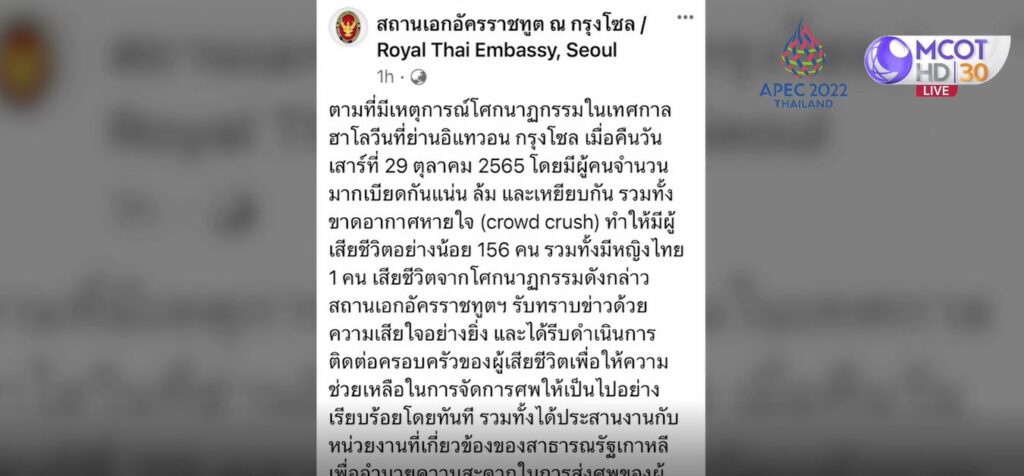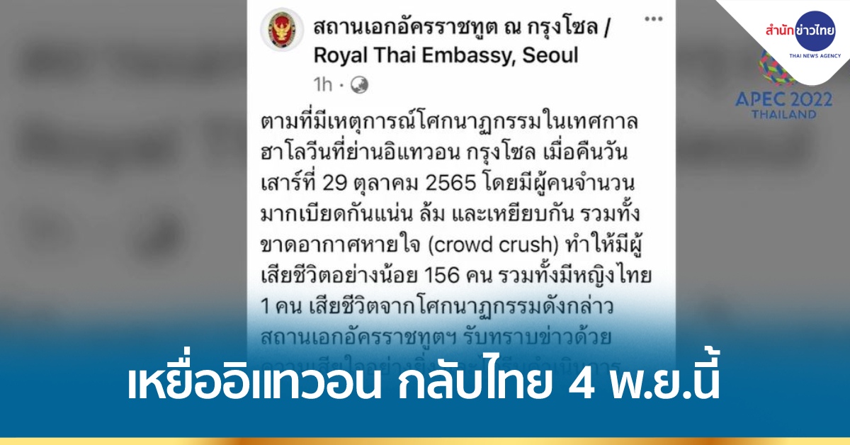 สถานเอกอัครราชทูต ณ กรุงโซล แจ้งว่า ตามที่มีเหตุการณ์โศกนาฏกรรมในเทศกาลฮาโลวีนที่ย่านอิแทวอน กรุงโซล เมื่อคืนวันเสาร์ที่ 29 ตุลาคม 2565 โดยมีผู้คนจำนวนมากเบียดกันแน่น ล้มและเหยียบกัน รวมทั้งขาดอากาศหายใจ ทำให้มีผู้เสียชีวิตอย่างน้อย 156 คน รวมทั้งมีหญิงไทย 1 คน เสียชีวิตจากโศกนาฏกรรมดังกล่าว สถานเอกอัครราชทูตฯ รับทราบข่าวด้วยความเสียใจอย่างยิ่ง และได้รีบดำเนินการติดต่อครอบครัวของผู้เสียชีวิต เพื่อให้ความช่วยเหลือในการจัดการศพให้เป็นไปอย่างเรียบร้อยโดยทันที รวมทั้งได้ประสานงานกับหน่วยงานที่เกี่ยวข้องของสาธารณรัฐเกาหลี เพื่ออำนวยความสะดวกในการส่งศพของผู้เสียชีวิตกลับไปประเทศไทย เพื่อให้ครอบครัวได้ประกอบพิธีทางศาสนาโดยเร็ว