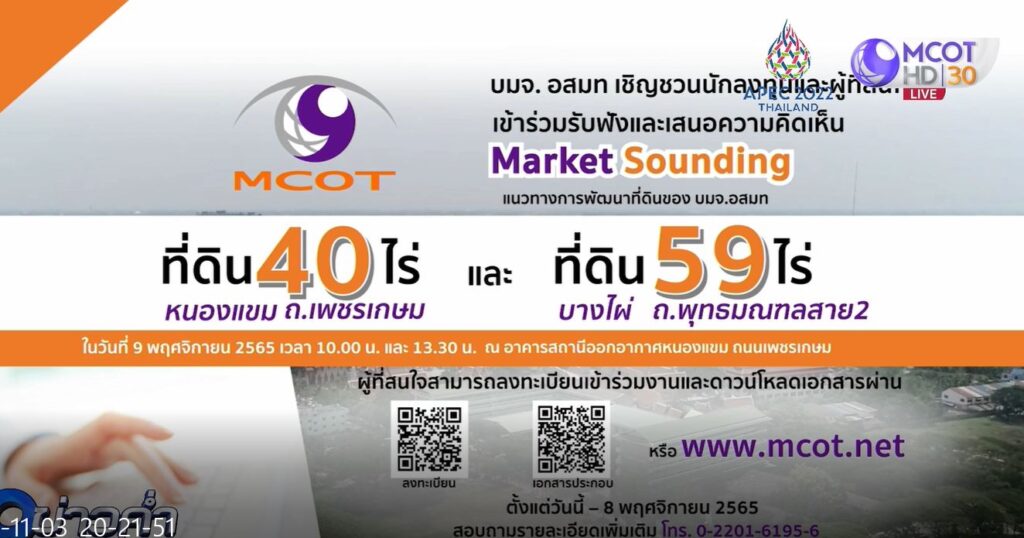 อสมท 3 พ.ย. – บมจ.อสมท เชิญชวนนักลงทุนและผู้ที่สนใจเข้าร่วมงานรับฟังและเสนอความคิดเห็น Market Sounding แนวทางการพัฒนาที่ดินทั้ง 3 แปลงของ บมจ.อสมท ในวันที่ 9 และ 22 พ.ย.นี้