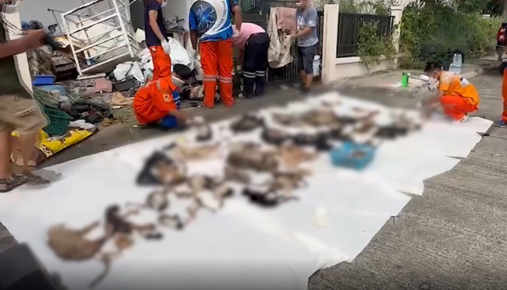 เจ้าหน้าที่บุกตรวจบ้านสงเคราะห์สัตว์ย่านคลองสามวา ที่พบหมาแมวถูกขังอดอาหารและน้ำ ป่วยตายเกือบร้อยตัวอีกครั้ง พร้อมช่วยแมวที่ยังหลงอยู่ในบ้านอีก 2 ตัว ส่งไปตรวจที่คลินิกสัตว์ ก่อนตรวจนับซากหมาแมวที่พบเมื่อวาน เพื่อเก็บเป็นหลักฐาน และเตรียมนำไปเผาที่วัดสัมมาชัญญาวาส เขตคลองสามวา ส่วนผลตรวจสุขภาพแมวที่ช่วยมาได้ 76 ตัวและหมา 4 ตัว พบว่ามีสภาพอิดโรย ร่างกายซูบผอม อ่อนแรง มีน้ำหนักต่ำกว่าเกณฑ์ 54 ตัว, ติดเชื้อ 2 ตัว และป่วยเข้าขั้นวิกฤติ 3 ตัว ที่เหลือมีอาการขาดน้ำและอาหาร มีสภาวะเลือดเป็นกรด โลหิตจาง ล่าสุดมีแมวตายเพิ่ม 3 ตัว และพรุ่งนี้จะแจ้งความเจ้าของสัตว์ ในความผิดตาม พ.ร.บ.ป้องกันการทารุณกรรมและการจัดสัตว์ใน 3 ข้อหา.-สำนักข่าวไทย